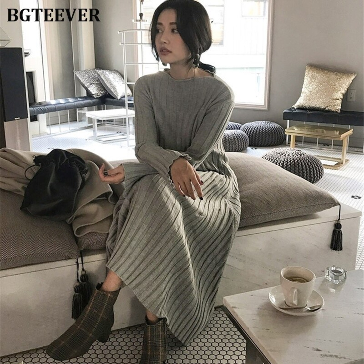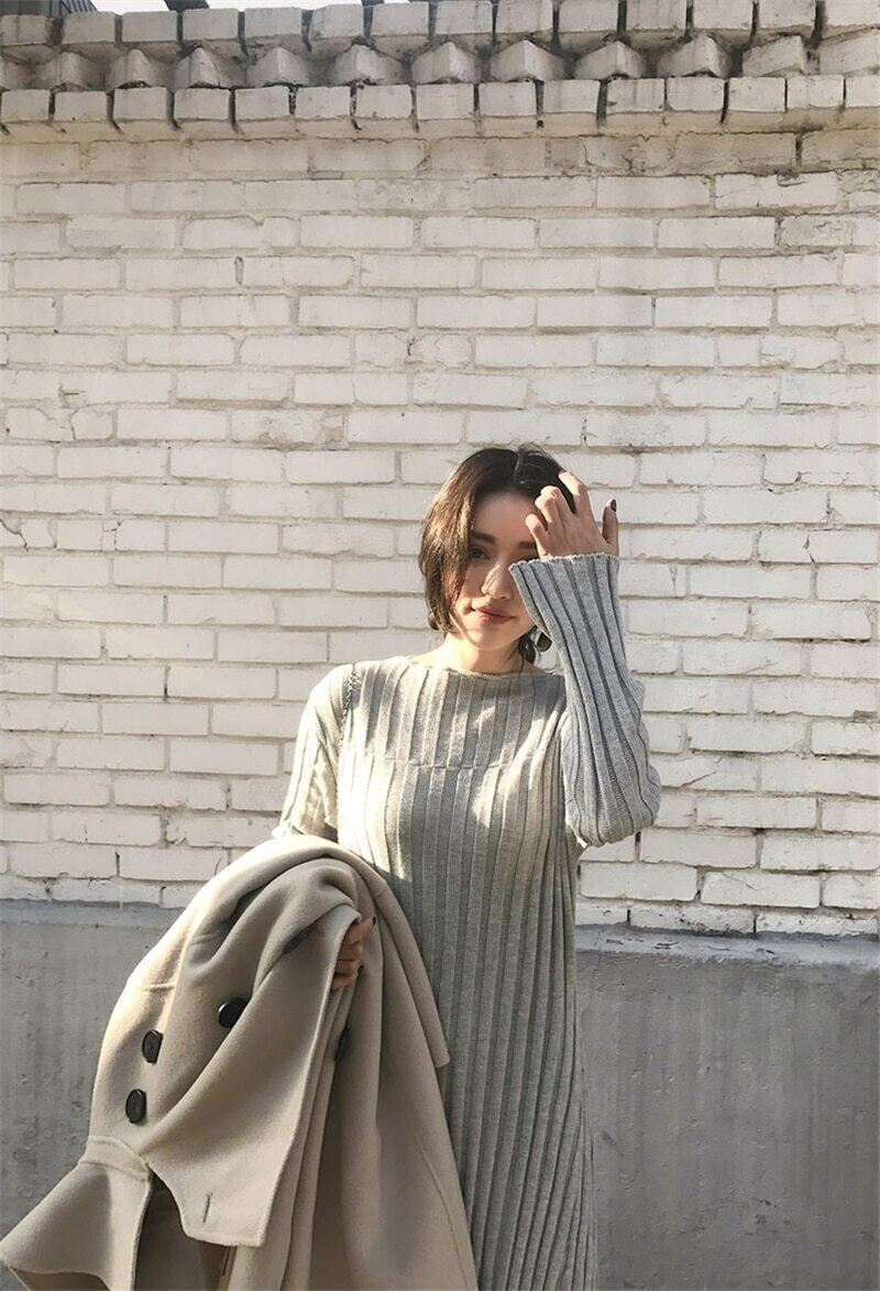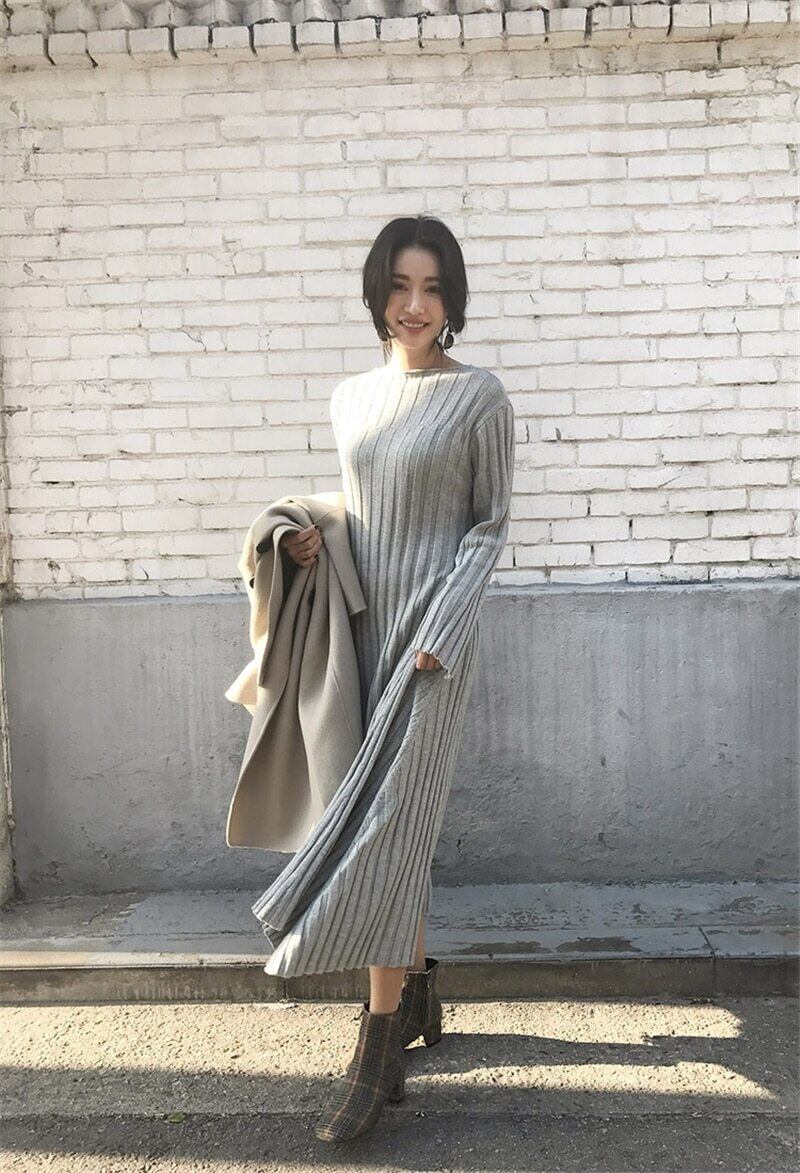 【新作】【送料無料】 秋冬ロングAライン女性セータードレスOネックストライプニットドレス2019厚手の暖かいプルオーバーセーターVestidos オータム 秋物 ウィンター 冬物 12b175095119609