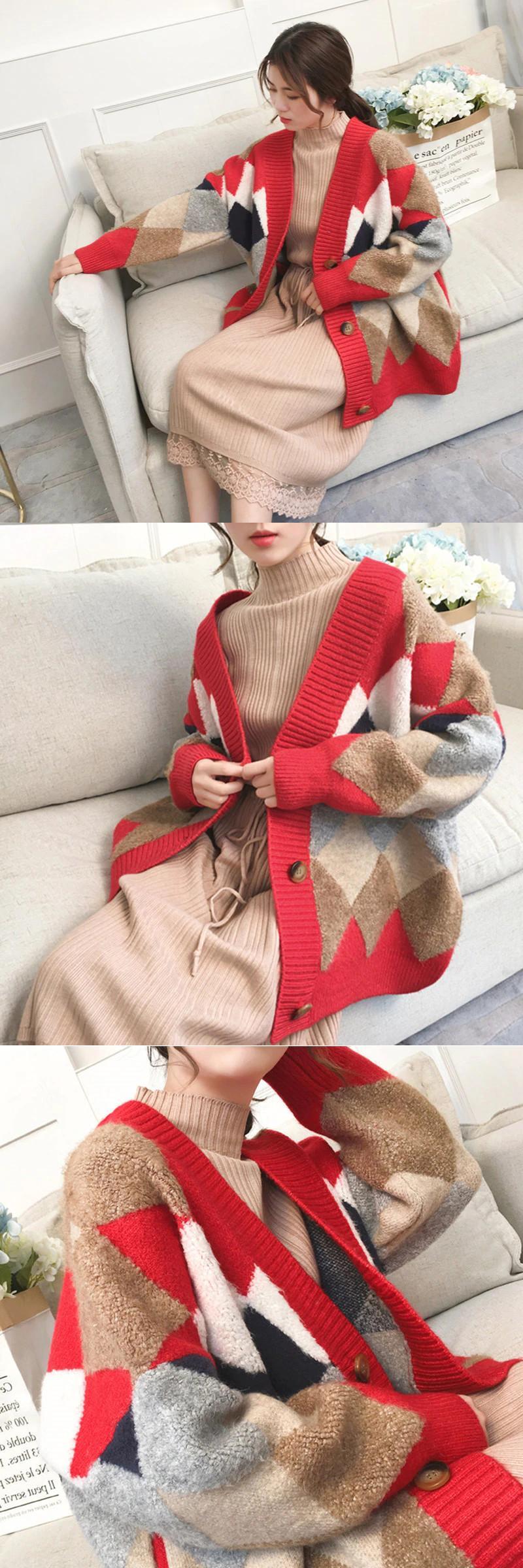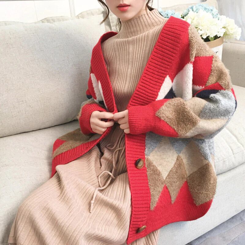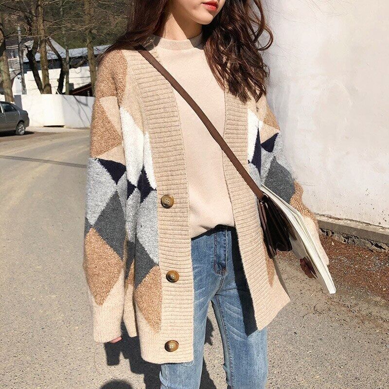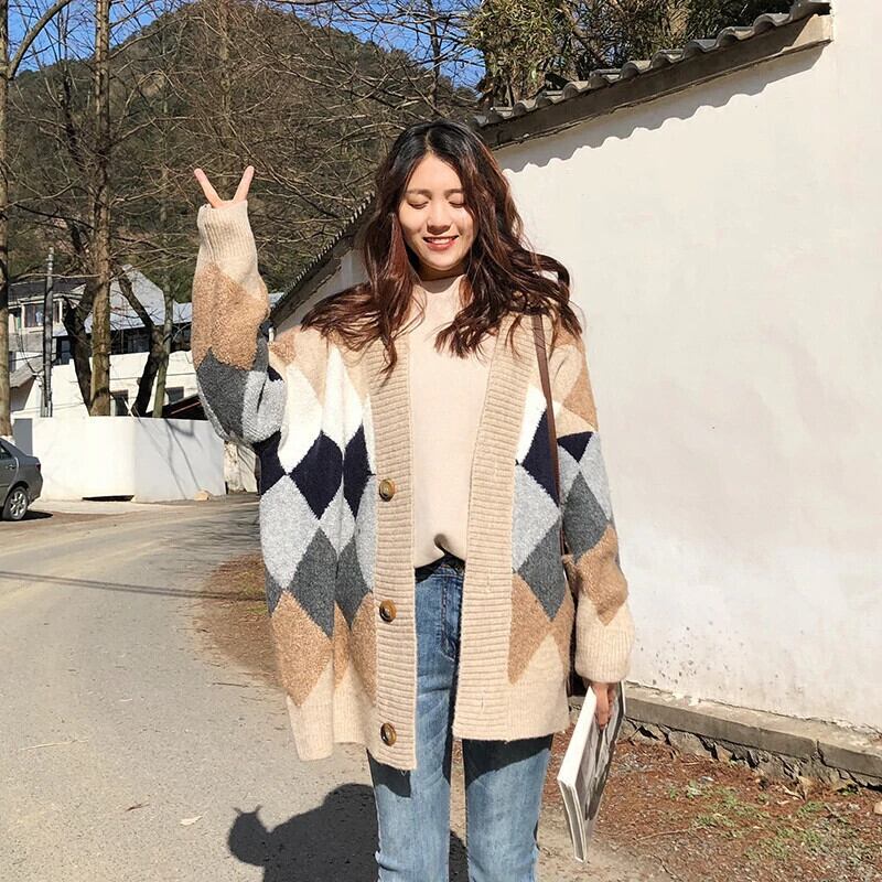 【新作】【送料無料】 2020ヴィンテージルーズチェック柄レディースカーディガン秋冬オープンステッチセーター厚手のカーディガンニットアウター オータム 秋物 ウィンター 冬物 ビンテージ 12b194699159544