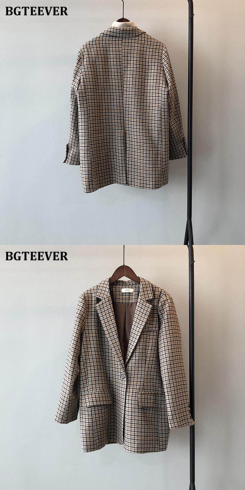 【新作】【送料無料】 BGTEEVERヴィンテージワンボタンレディースウールブレザー長袖厚手のチェック柄スーツジャケット2020秋冬アウター ロング オータム 秋物 ウィンター 冬物 ビンテージ 12b159261673971