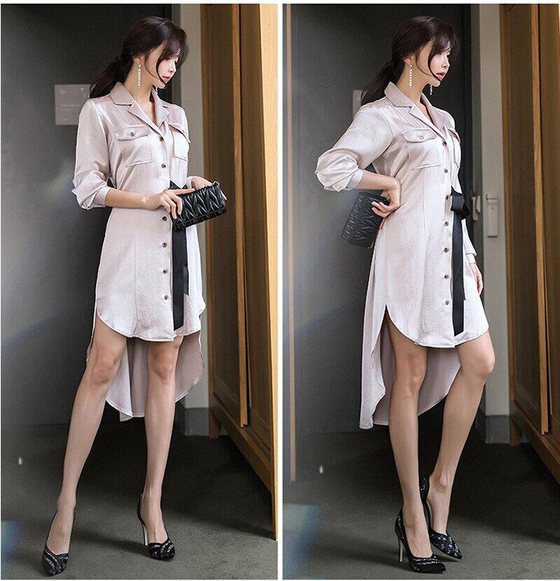 【新作】【送料無料】 BGTEEVERノッチカラーレースアップレディースシャツドレス不規則なフルスリーブルーズミディドレス 12b183580674035
