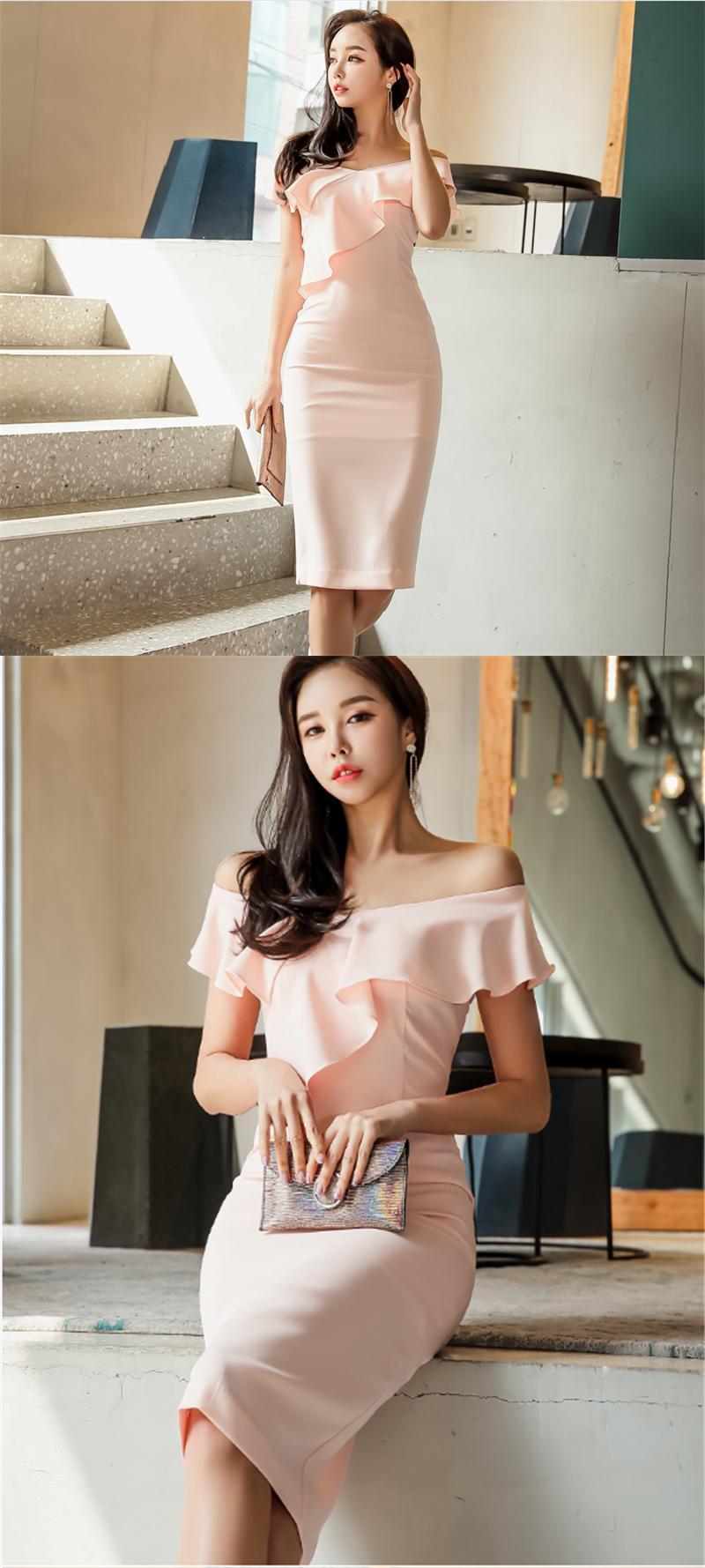 【新作】【送料無料】 スラッシュネックフリルネックレディースボディコンドレスオフショルダースリムウエストペンシルドレス2019Office Vestidos ラッフル 会社 学校 通勤や通学にも 12b142697041439