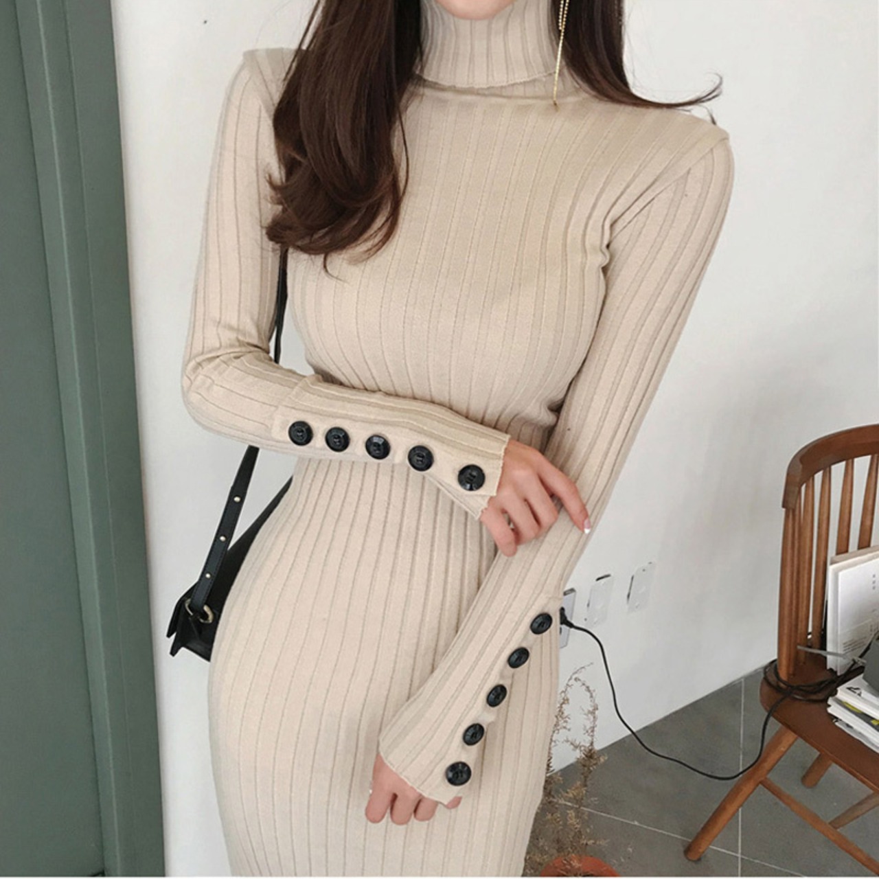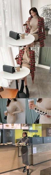 【新作】【送料無料】 春のボタンタートルネックニットドレス女性ストレッチ伸縮性スキニーセータードレスロング エラスティック スプリング 春物 12b176024884343