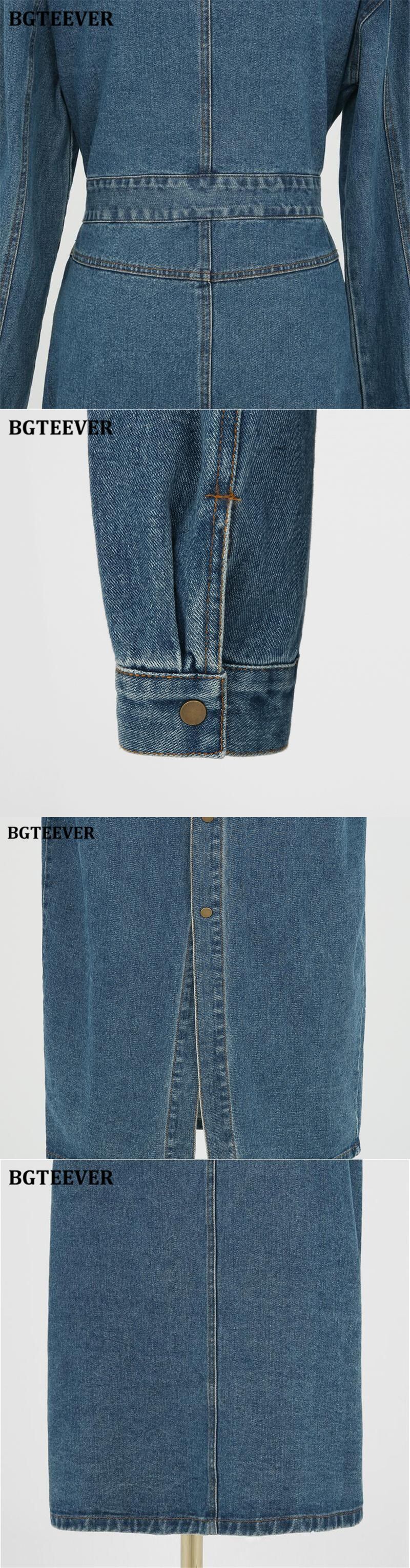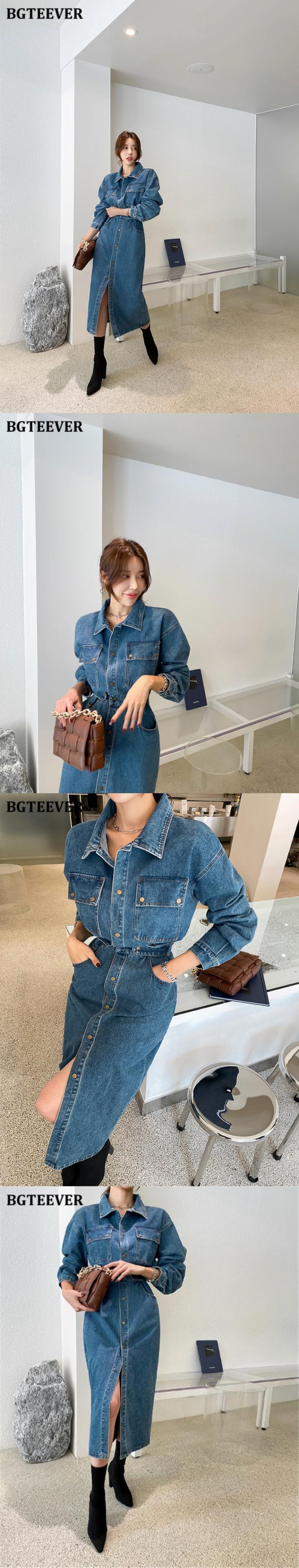 【新作】【送料無料】 BGTEEVERストリートウェアターンダウンカラースリムデニムドレスレディースシックなシングルブレストフルスリーブレディーススプリットジーンズドレス2020 12b189566538587
