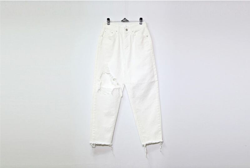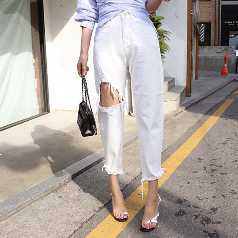【新作】【送料無料】 ホワイトジーンズレディースウエストリップドホールフリンジ裾ハーレムデニムジーンズ2019ストリートウェアレディースデニムパンツ 12b120784342301