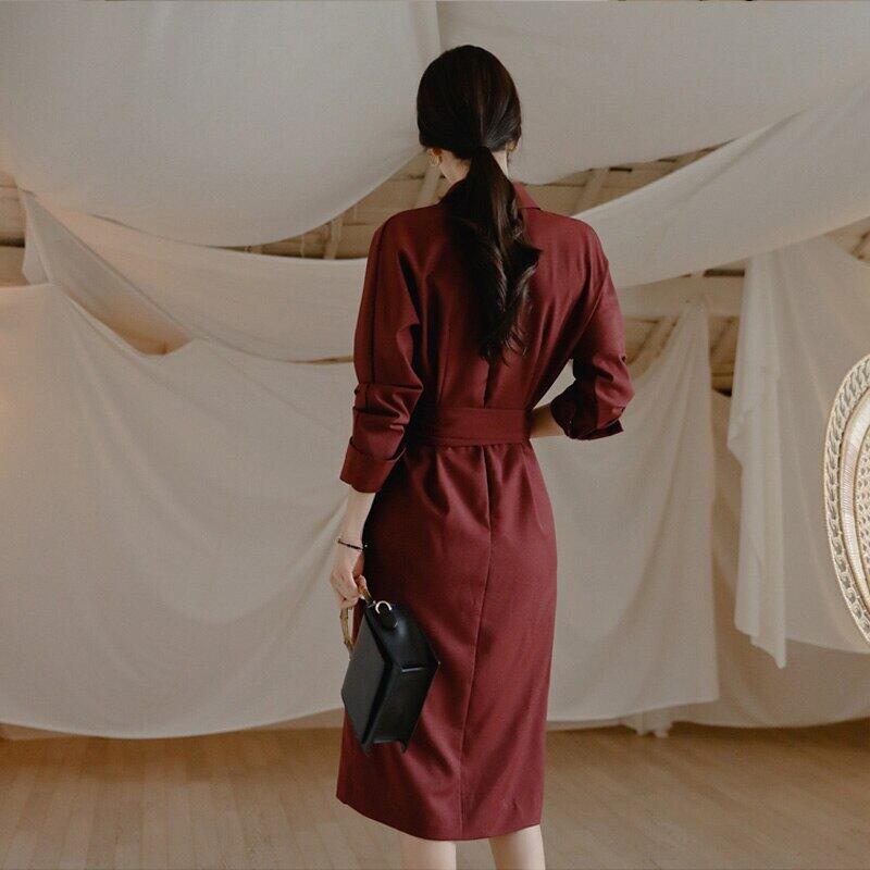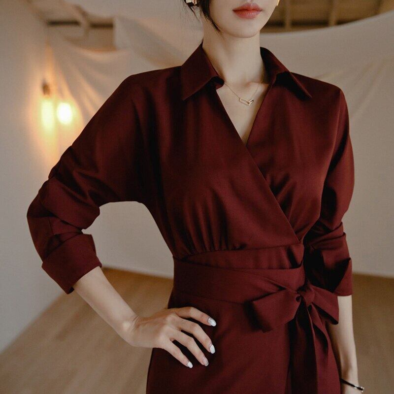 【新作】【送料無料】 BGTEEVERソリッドVネックレースアップレディースドレスフルスリーブオフィスベルトドレス2019秋冬膝丈Vestidos オータム 秋物 ウィンター 冬物 ハーネス ソリッドカラー 会社 学校 通勤や通学にも 12b185549532696