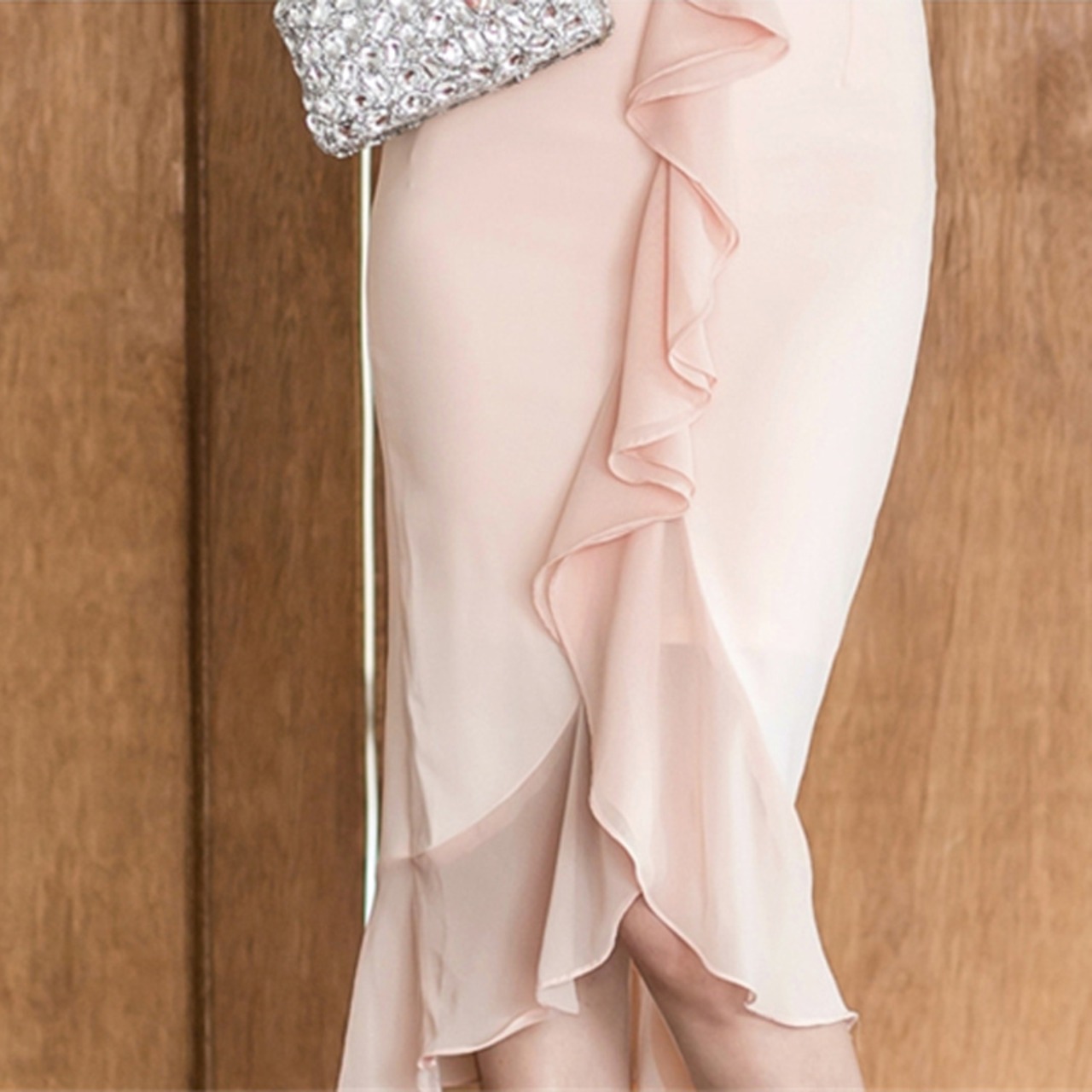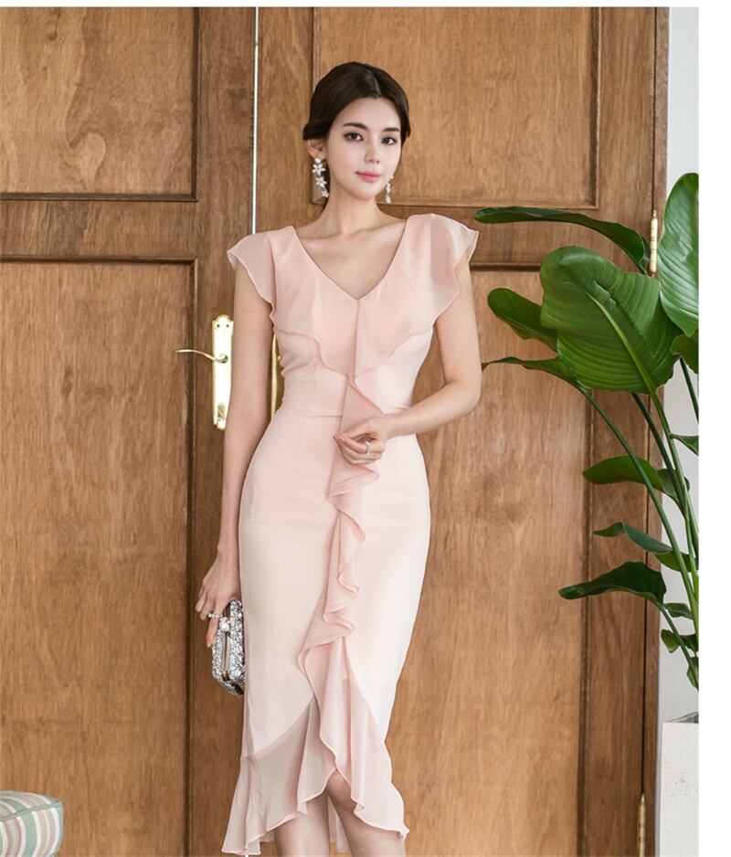【新作】【送料無料】 Vネックボディコンフリル女性ドレスバタフライスリーブ不規則なミディパーティードレス ラッフル 12b119192871585
