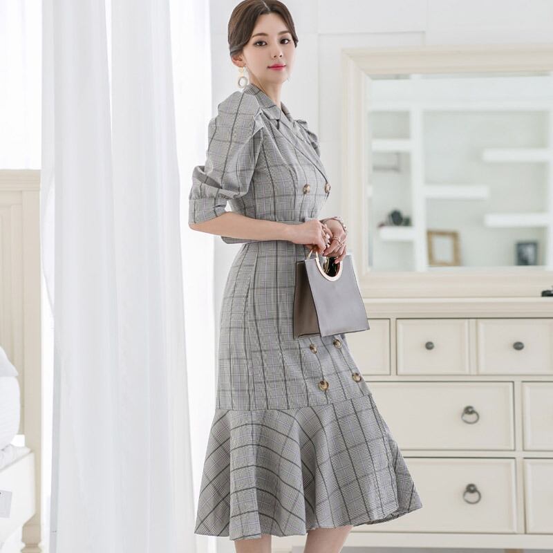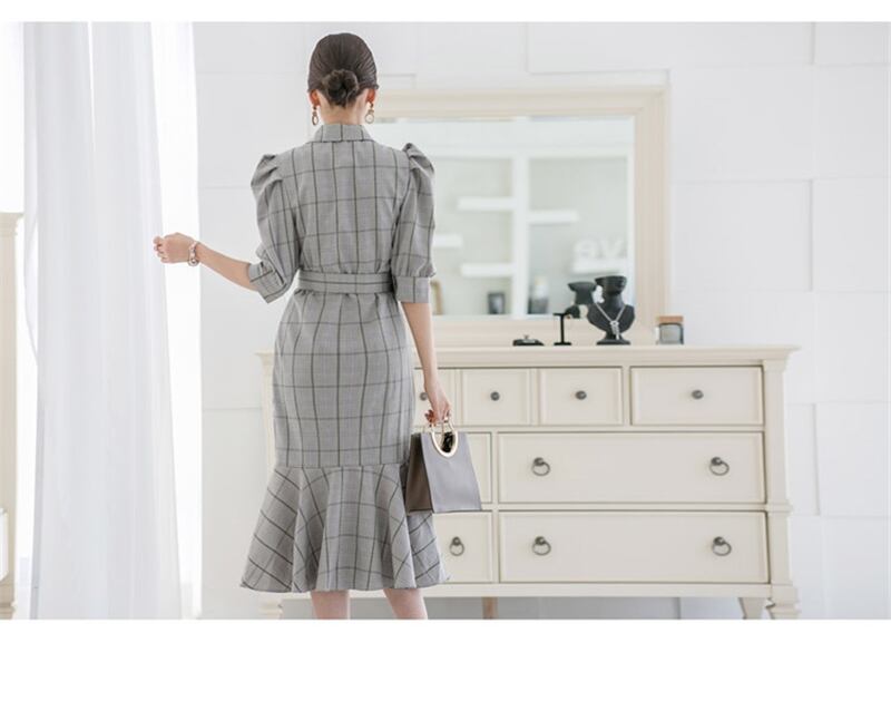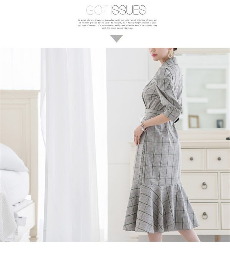 【新作】【送料無料】 オフィスフリルチェック柄ロングレディースワンピースノッチカラーダブルブレストサッシワンピース ラッフル 会社 学校 通勤や通学にも 12b167675573529