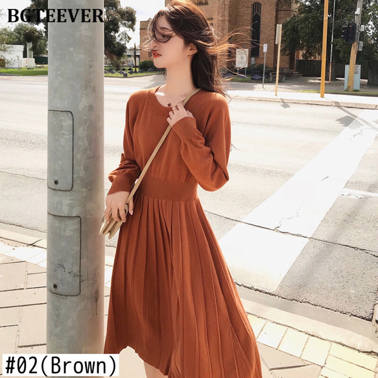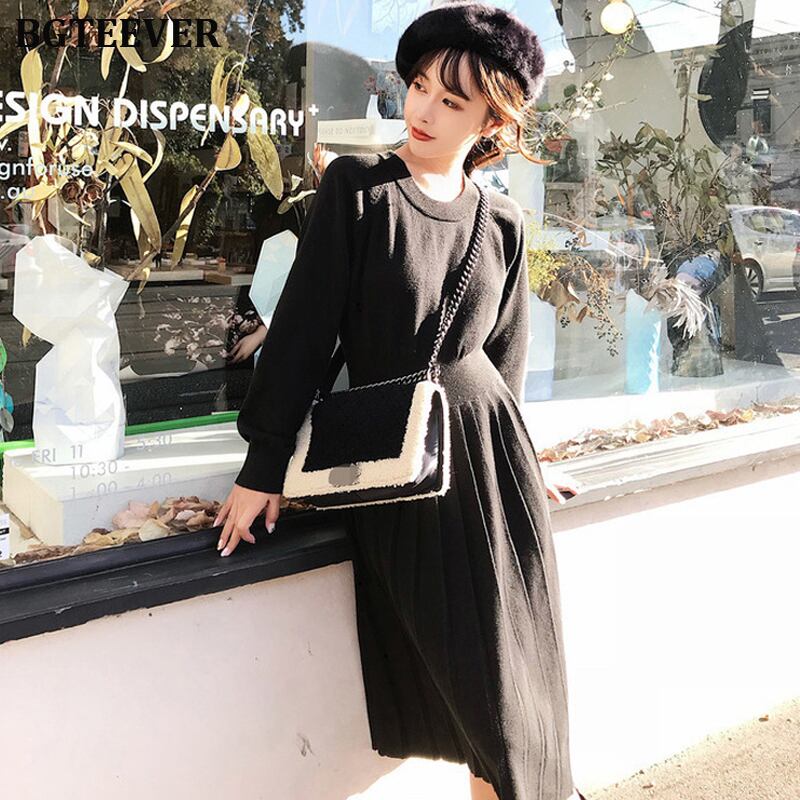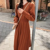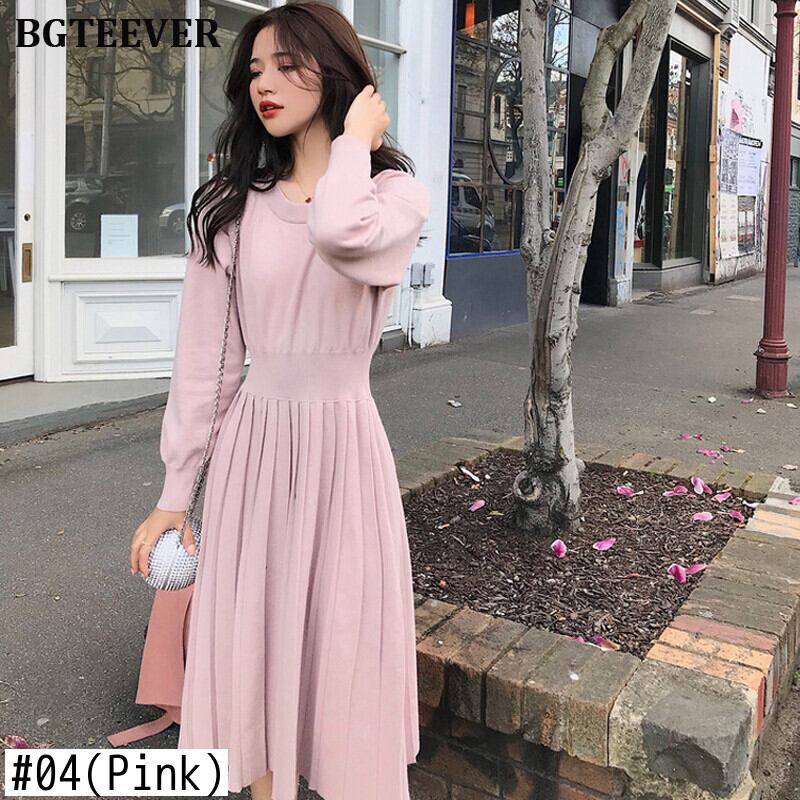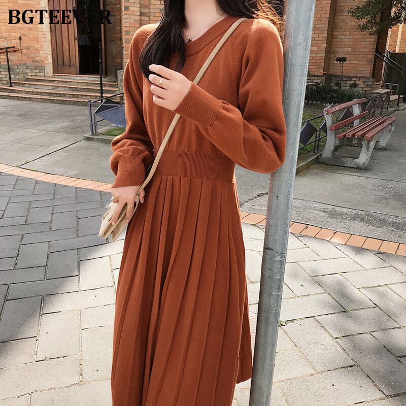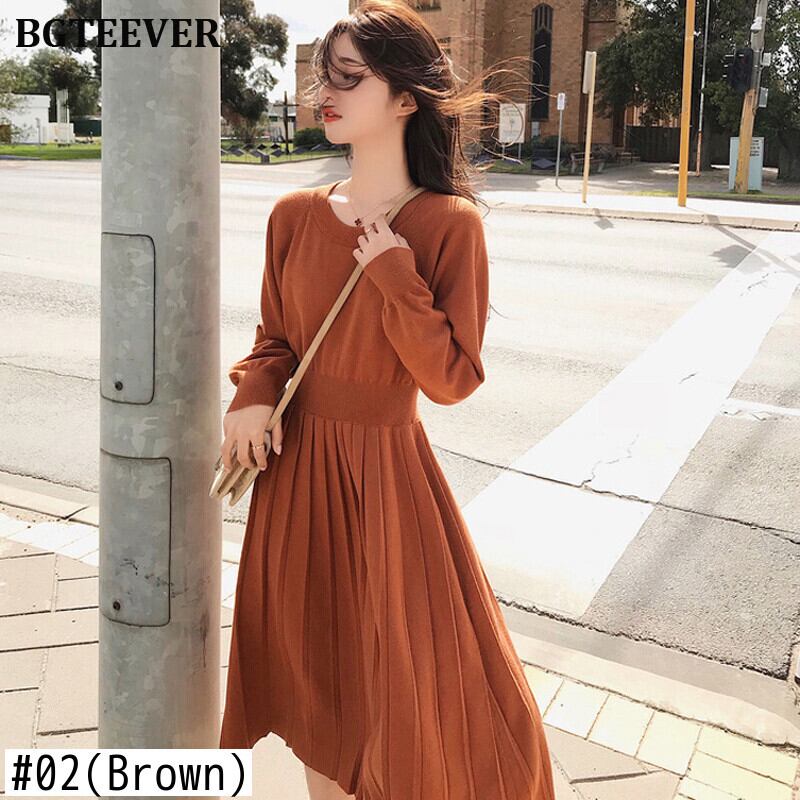【新作】【送料無料】 プリーツレディースニットセータードレスAライン長袖スリムウエスト秋冬ドレスソリッドミディニットVestidos ロング オータム 秋物 ウィンター 冬物 ソリッドカラー 12b19649523192
