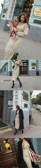 【新作】【送料無料】 BGTEEVERセクシーなVネックレースアップ女性セータードレスサイドスプリット秋冬ドレスシースニットジャンパー オータム 秋物 ウィンター 冬物 12b1559378027