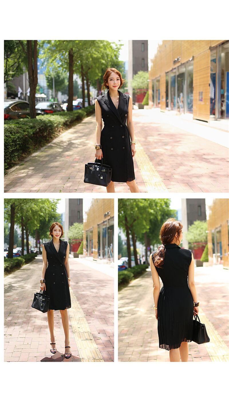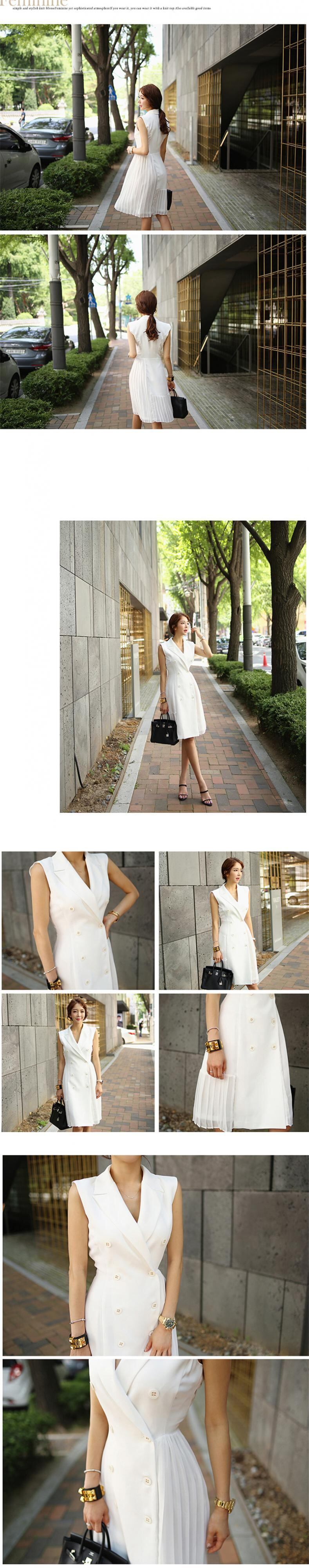 【新作】【送料無料】 VネックダブルブレストレディースホワイトドレスヴィンテージプリーツパッチワークレディースドレスノースリーブOLスタイル ビンテージ 12b136990792511