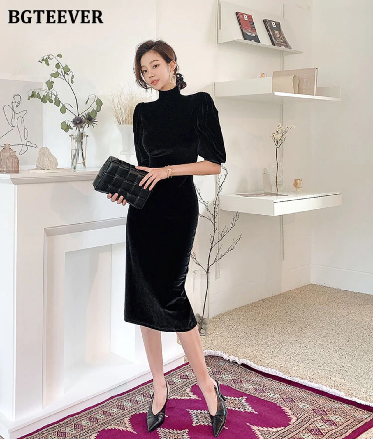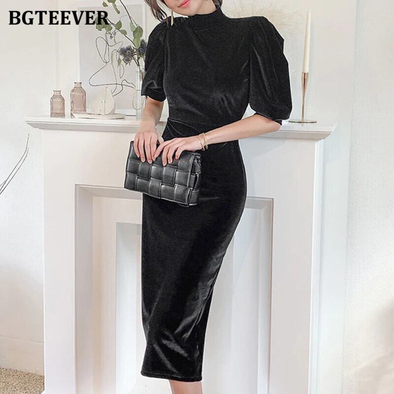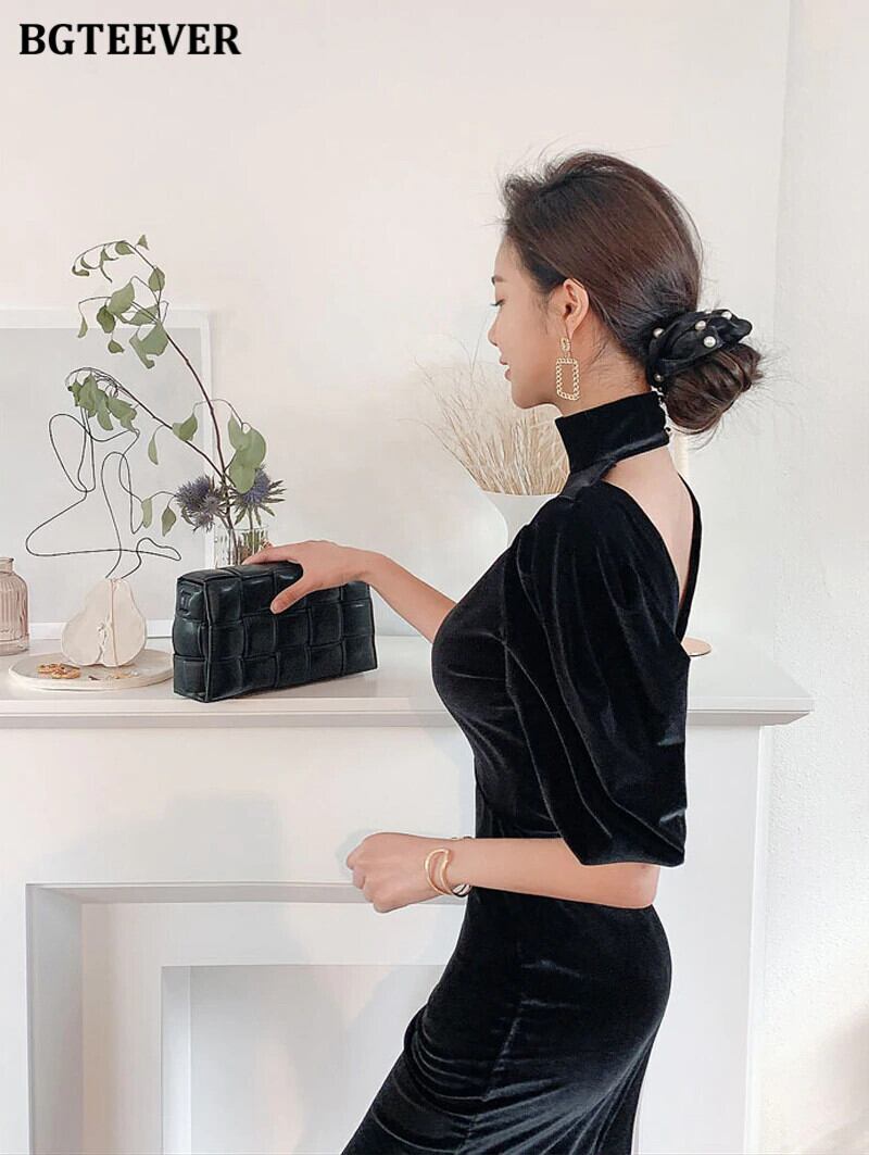 【新作】【送料無料】 BGTEEVERタートルネックハーフスリーブスプリットウィメンズドレス2020オータムホロウアウトバックレスセクシーブラックベルベットシースドレス 半袖 秋物 12b116846896039
