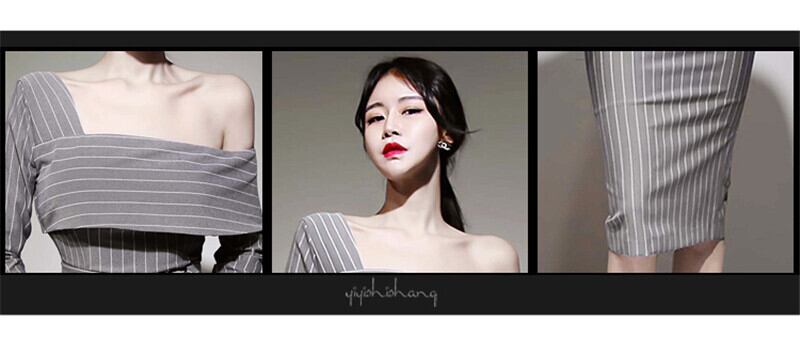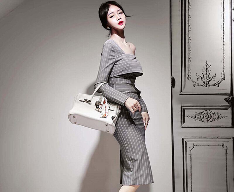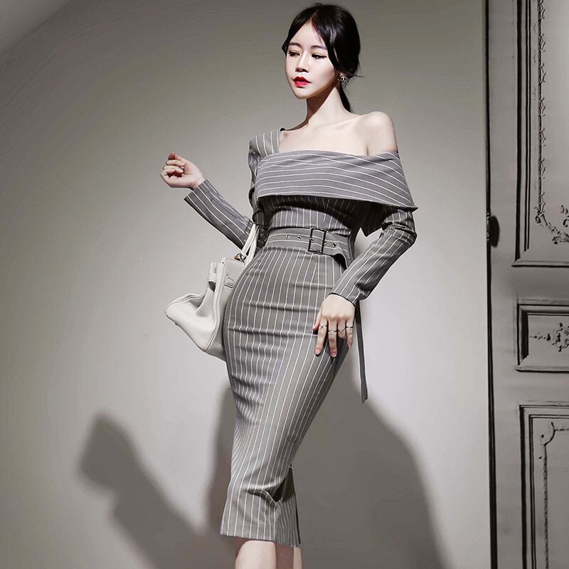 【新作】【送料無料】 BGTEEVEROLスタイルワンショルダーストライプレディースワンピースフルスリーブサッシベルトワンピース膝丈ボディコンミディヴェスティドス2019 ハーネス 12b157272450951