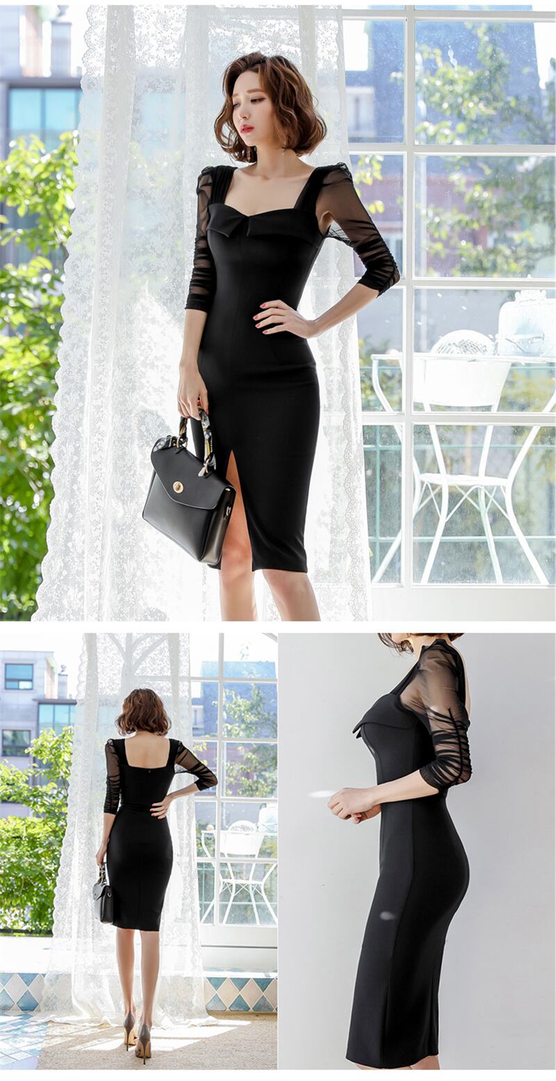 【新作】【送料無料】 BGTEEVERセクシーミディブラックドレス女性スクエアネックメッシュスリーブスキニードレスボディコンスプリットパーティーVestidosfemme 2019 フェミニン スクウェア 12b196023825445