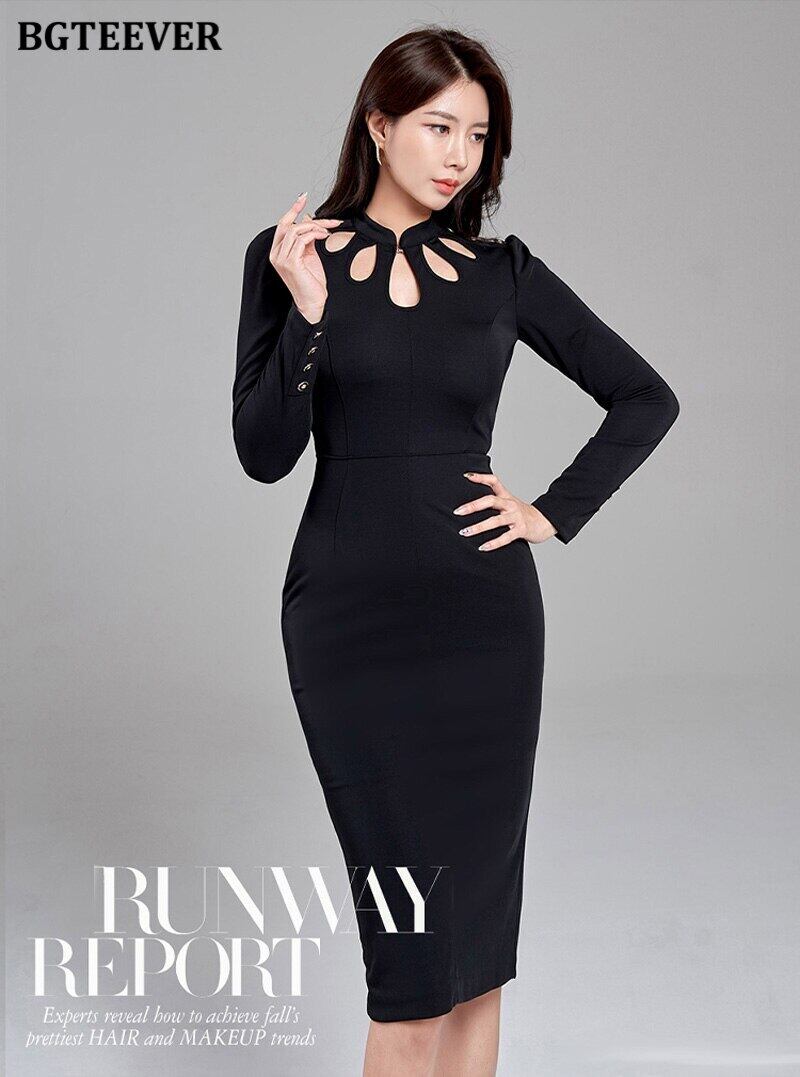 【新作】【送料無料】 BGTEEVER 2020Oネックスリムウエストレディースブラック膝丈ドレスフルスリーブボディコンスキニーVestidos 12b192743197798