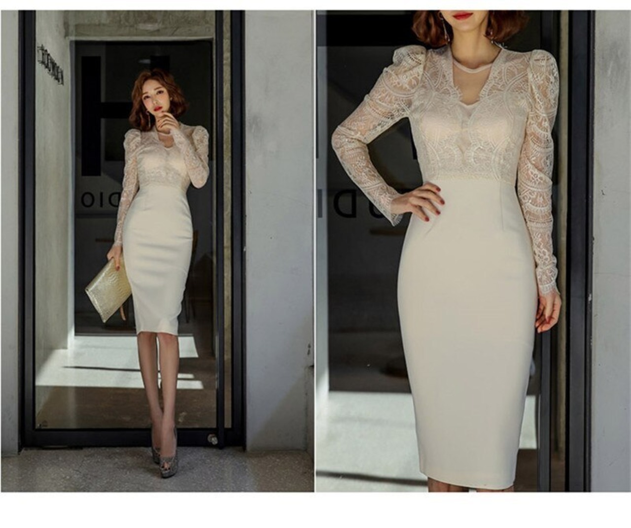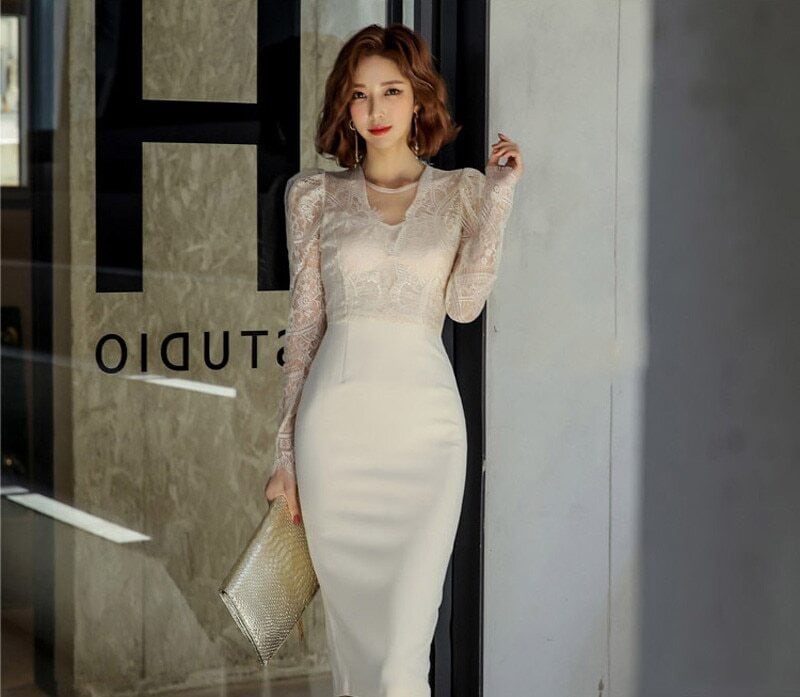 【新作】【送料無料】 BGTEEVERエレガンVネックレースパッチワークレディースドレス中空ヒップパッケージドレス膝丈ボディコンVestidos 12b112116328464