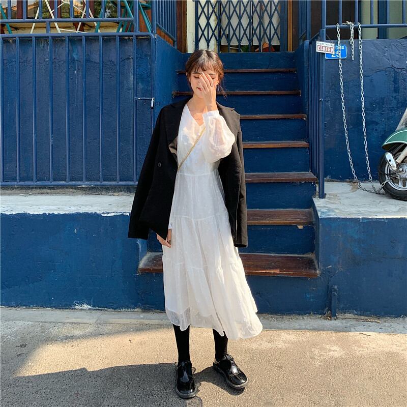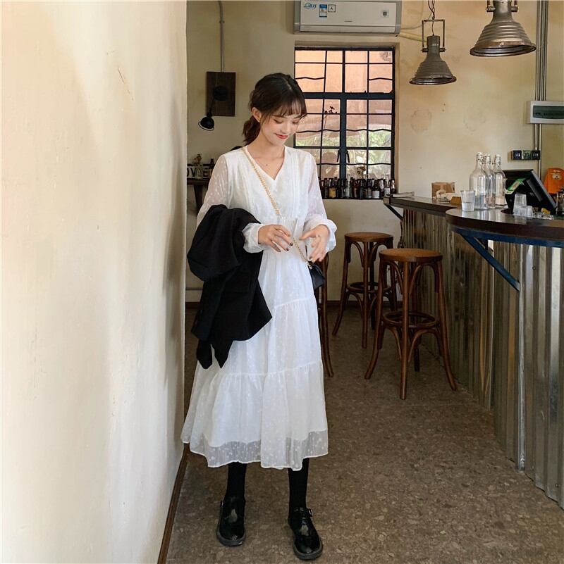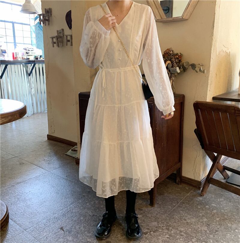 【新作】【送料無料】 BGTEEVERVネック水玉女性シフォンドレスレースアップウエストフルスリーブロングVestidosAラインホワイトドレス2020 12b150899029827