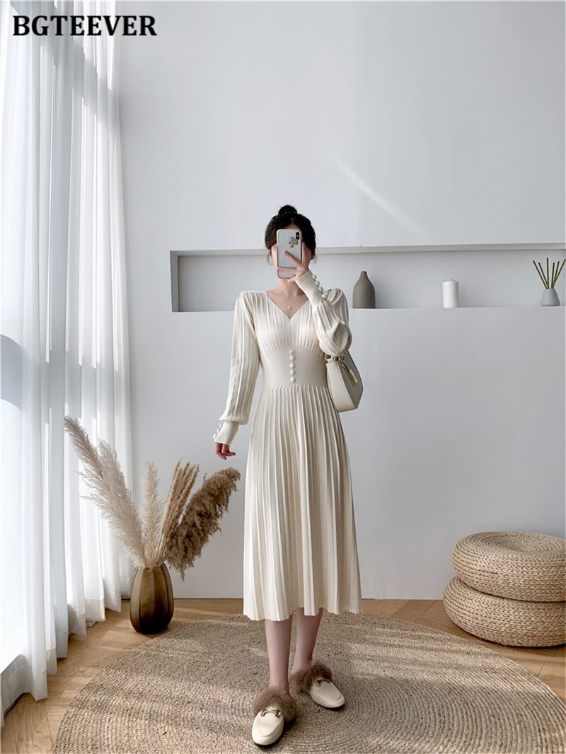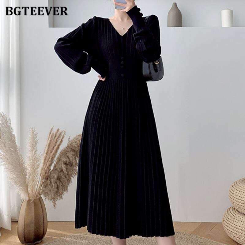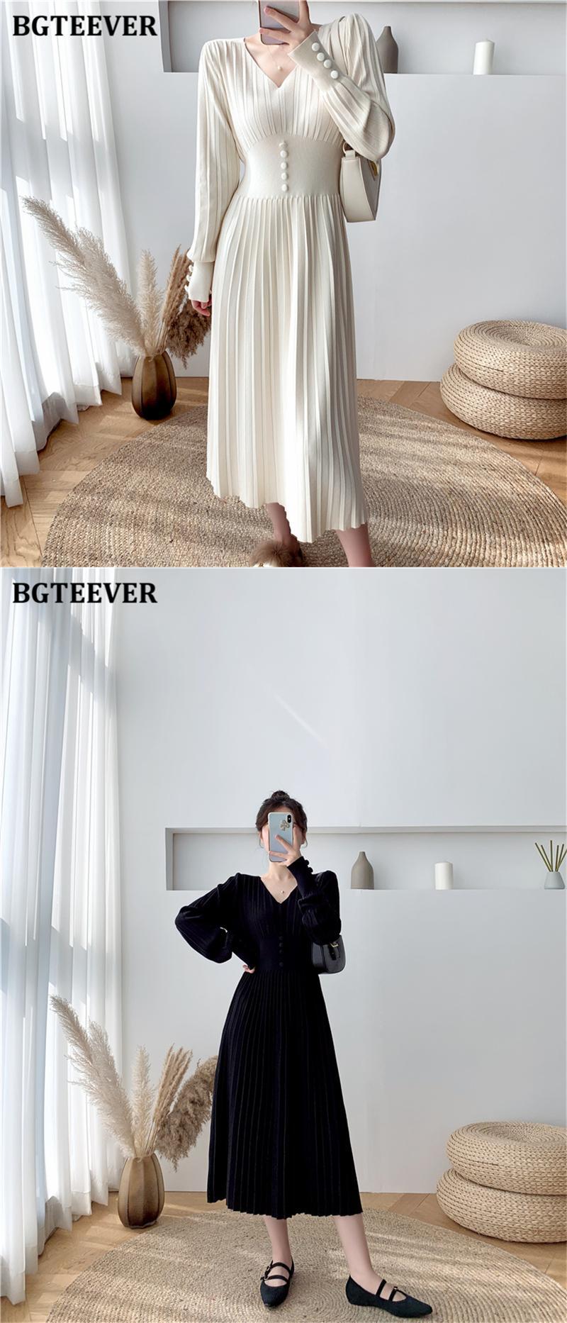 【新作】【送料無料】 BGTEEVERVネックウォームプリーツセータードレスレディーススリムウエストボタンニットミドル丈ドレス2020Winter Vestidos ウィンター 冬物 12b125469972736