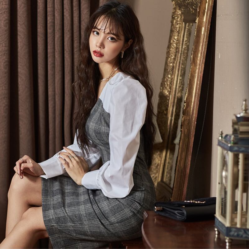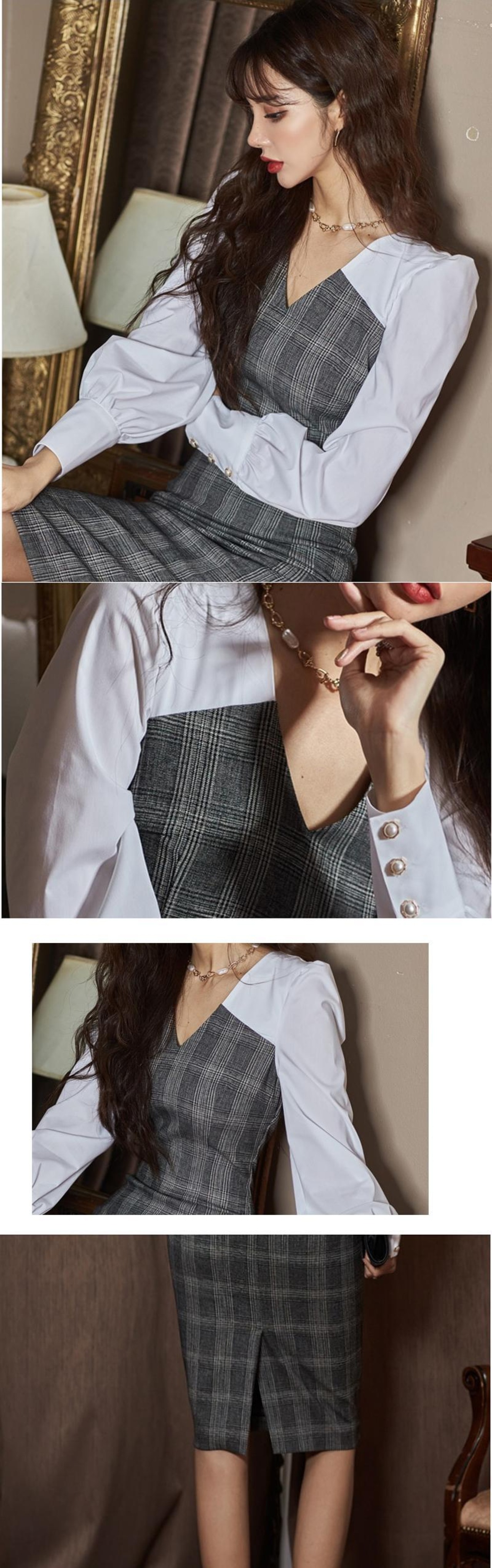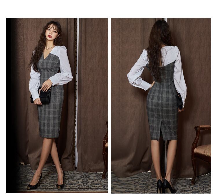 【新作】【送料無料】 BGTEEVERVネックパッチワークチェック柄OLドレスフルスリーブスリムウエストスキニードレススプリットミディレディースドレス2020Vestidosの後ろ 12b131443878158