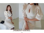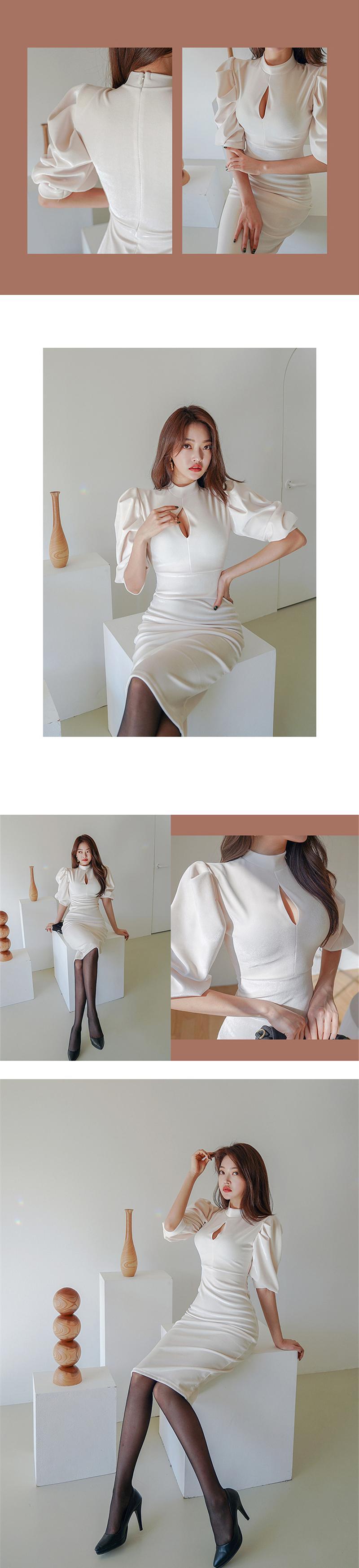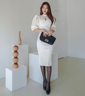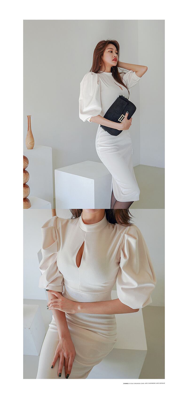 【新作】【送料無料】 BGTEEVER女性スタンドカラー中空アウトホワイトドレスハーフパフスリーブスリムウエストペンシルドレスオフィスシックなVestidos 会社 学校 通勤や通学にも 12b137090596946