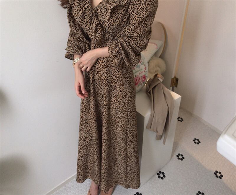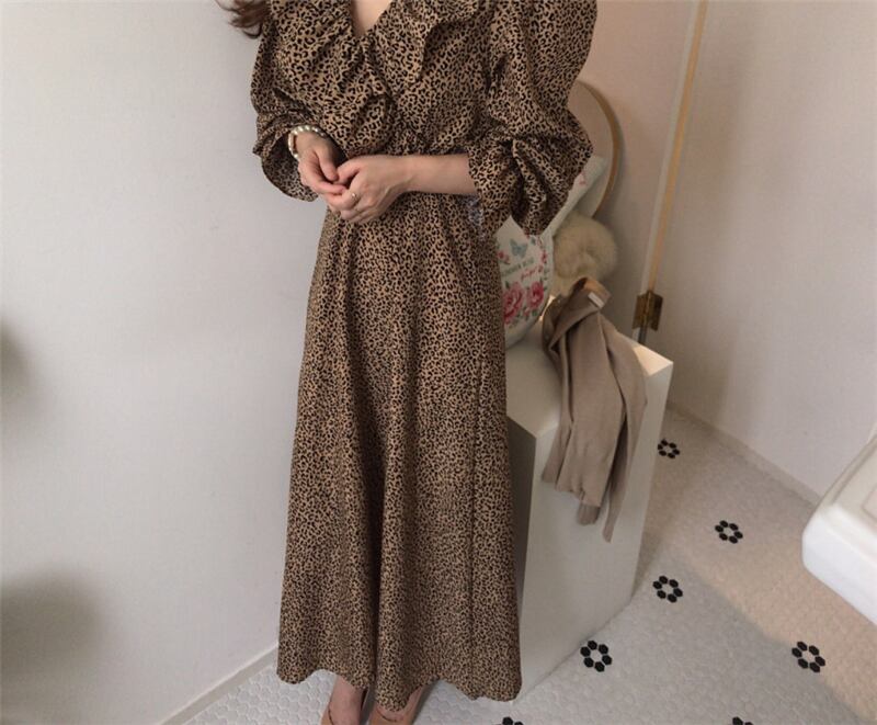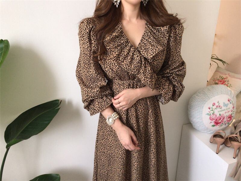 【新作】【送料無料】 BGTEEVERヴィンテージVネックフリルヒョウ柄レディースドレス2020春長袖AラインドレスMidiVestidos femme ロング ラッフル スプリング 春物 フェミニン ビンテージ 12b126020507120