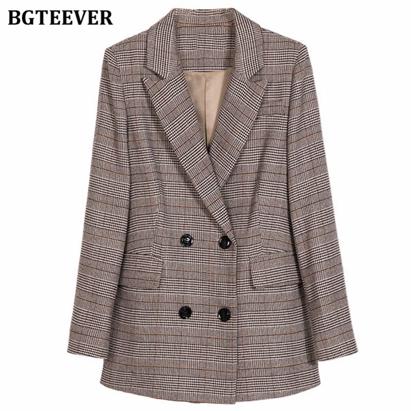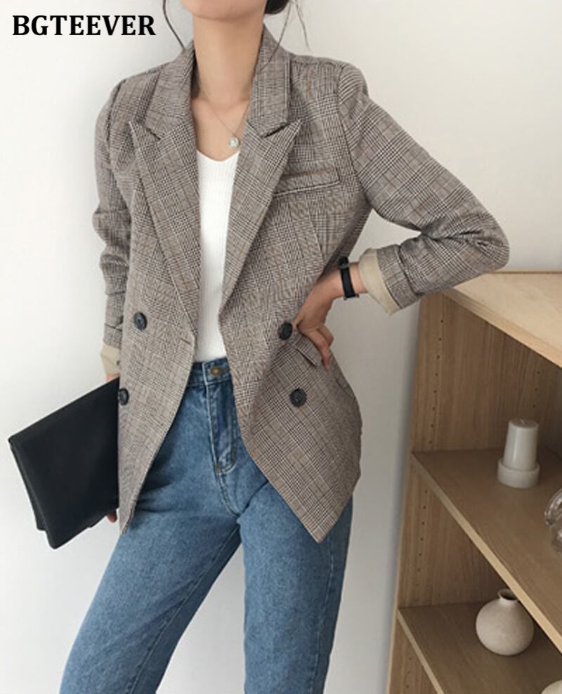 【新作】【送料無料】 BGTEEVERシックなヴィンテージノッチカラーレディースチェック柄ブレザージャケット厚く暖かいダブルブレストルーズスーツコート2020冬 ウィンター 冬物 ビンテージ 12b180578620021