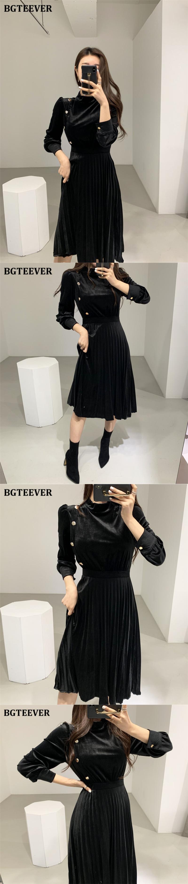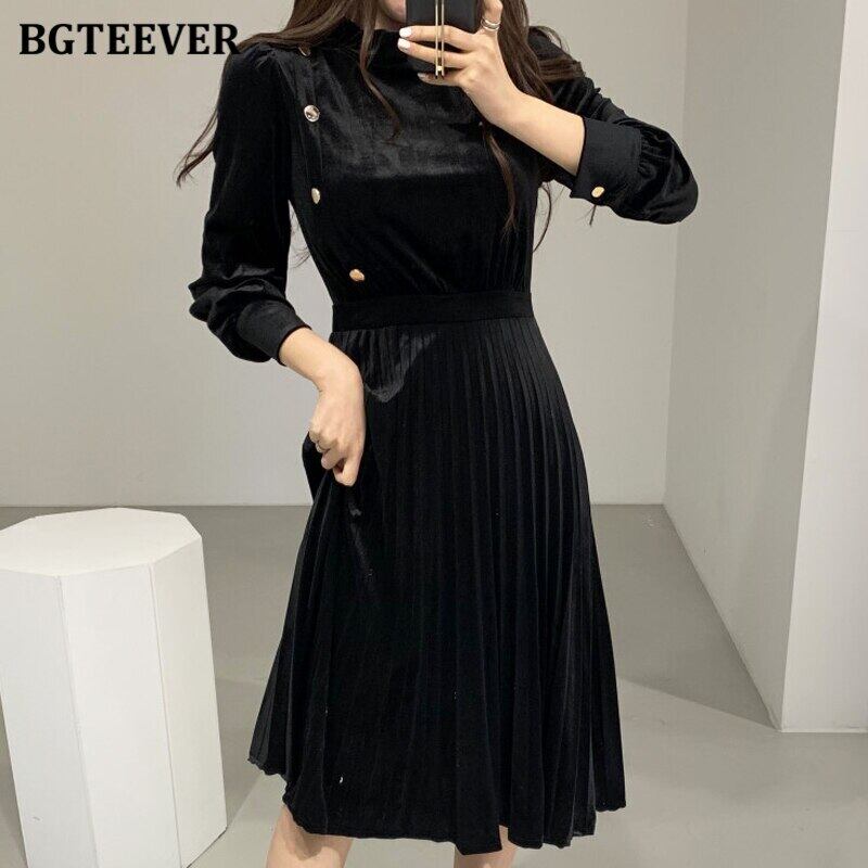 【新作】【送料無料】 BGTEEVERシックなスタンドカラーシングルブレスト女性ベルベットドレス2020冬スリムウエスト暖かいプリーツドレスAラインVestidos ウィンター 冬物 12b154913882203