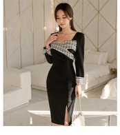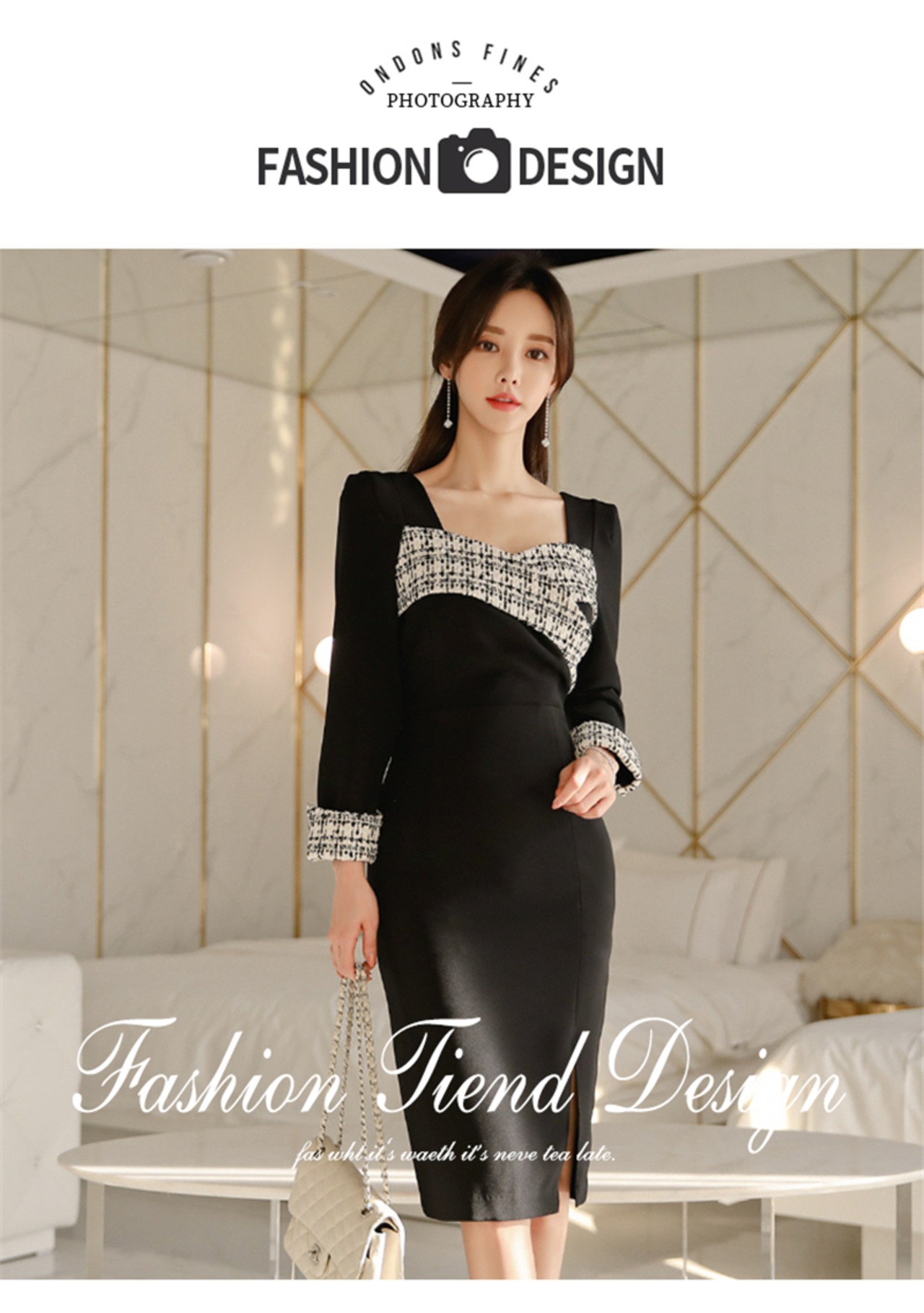 【新作】【送料無料】 春のスクエアカラースリムドレスシックなパッチワーク女性ボディコンドレス長袖スプリットVestidos ロング スプリング 春物 スクウェア 12b164066007136