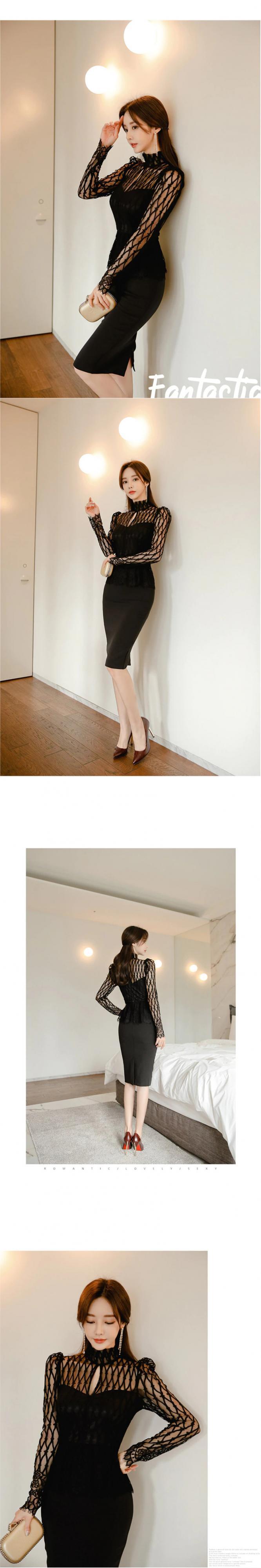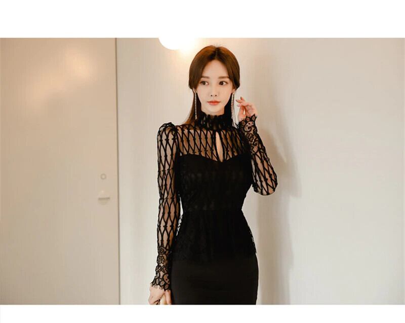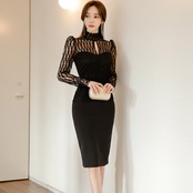 【新作】【送料無料】 BGTEEVERレースパッチワークレディースシースドレススタンドカラー中空ブラックパーティードレス長袖MidiVestidos 2020 ロング 12b125588361834