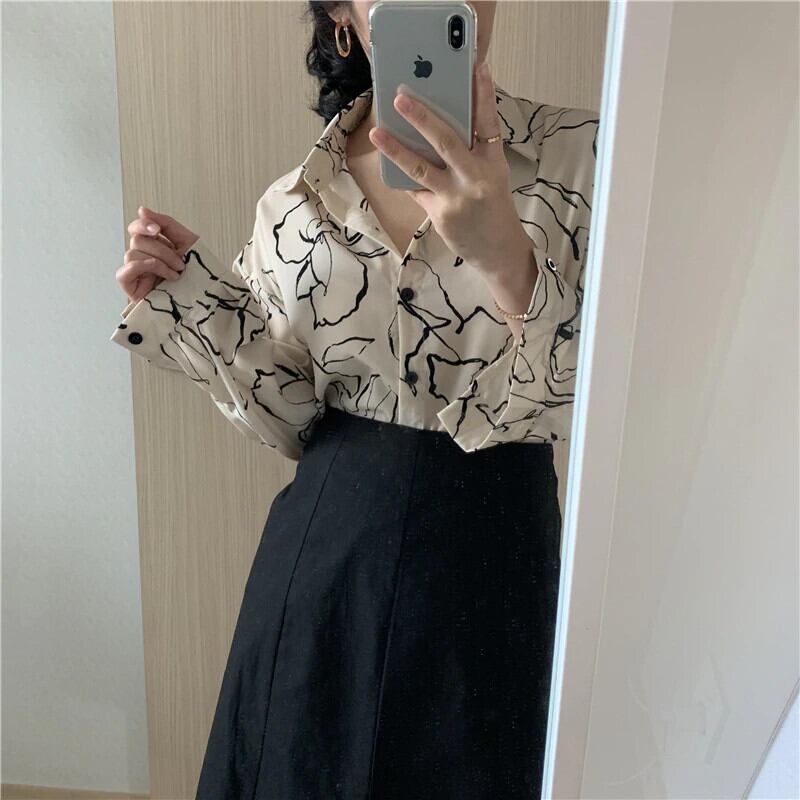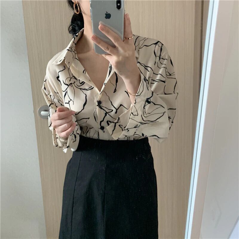 【新作】【送料無料】 春のルースウィミンブラウスターンダウンカラープリントシャツトップスシングルブレスト長袖シックなシャツ ロング スプリング 春物 12b127613513921