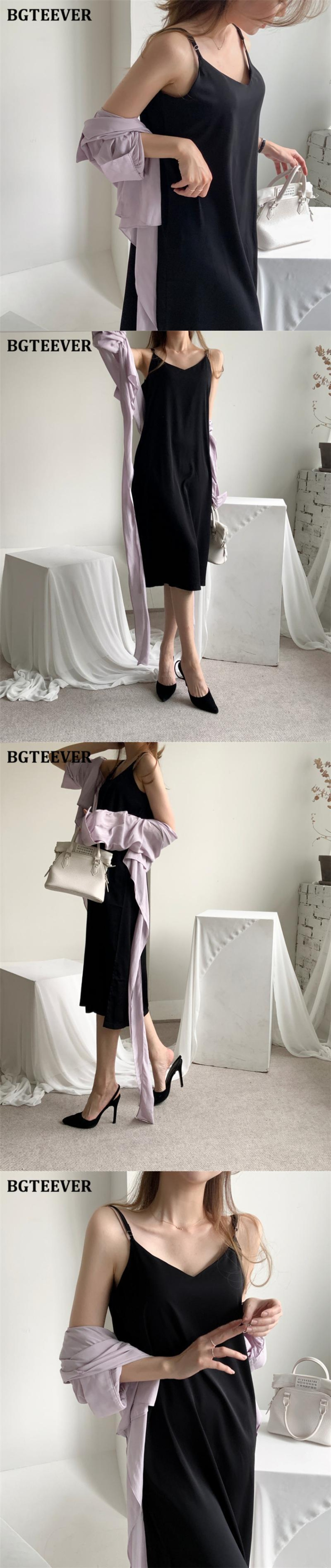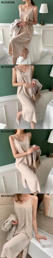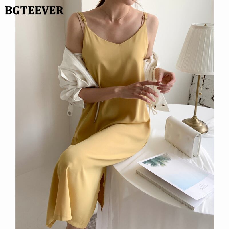 【新作】【送料無料】 BGTEEVERサマーVネックスパゲッティストラップレディースドレスシンプルなルーズノースリーブスプリットミディドレス 夏物 12b131409523675
