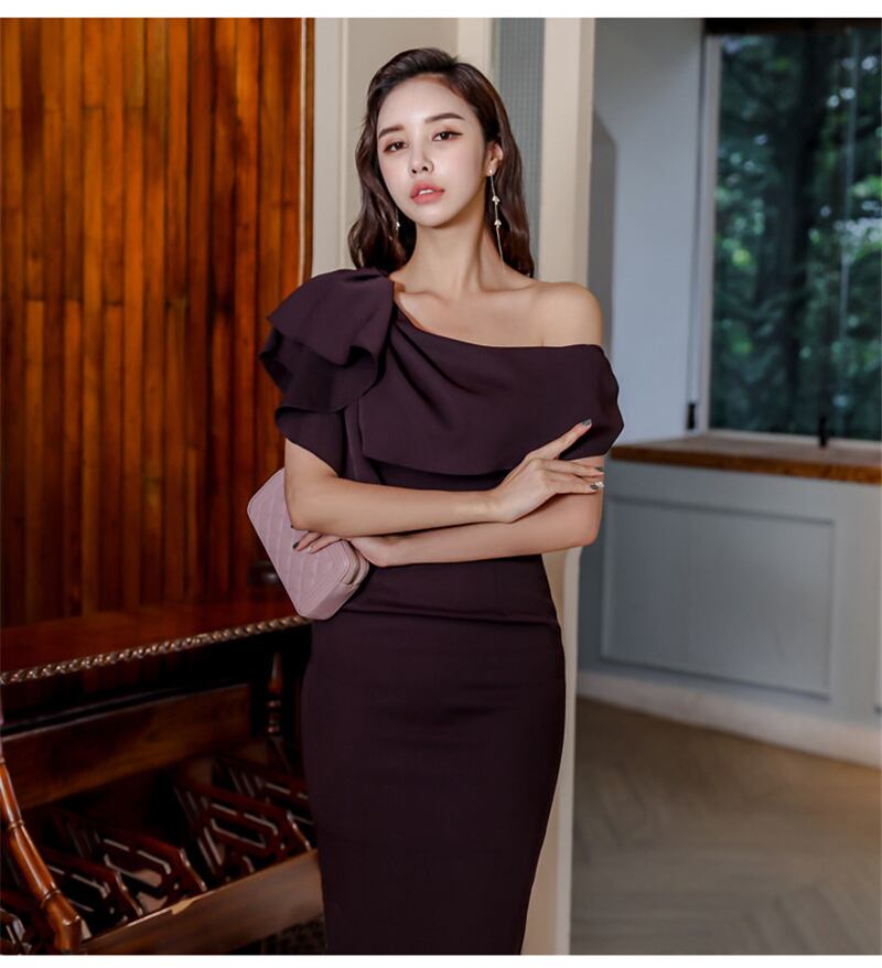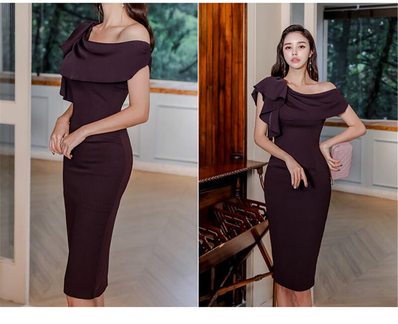 【新作】【送料無料】 BGTEEVERスラッシュネックペンシルドレス女性ワンショルダーフリルスリムウエストパーティードレスバックレスミディVestidosファム ラッフル フェミニン 12b19011304612