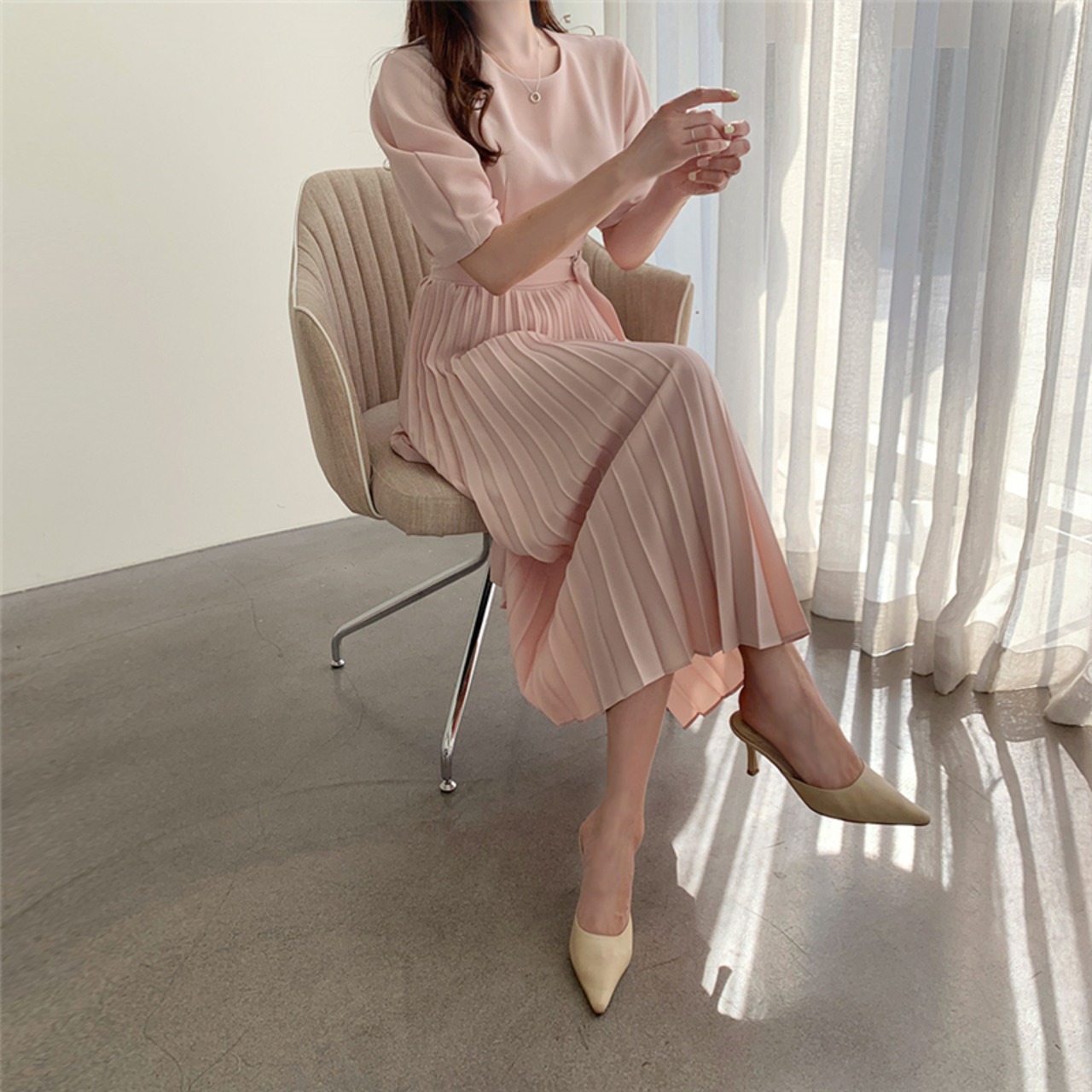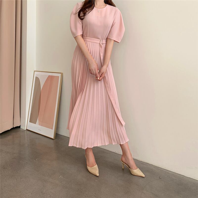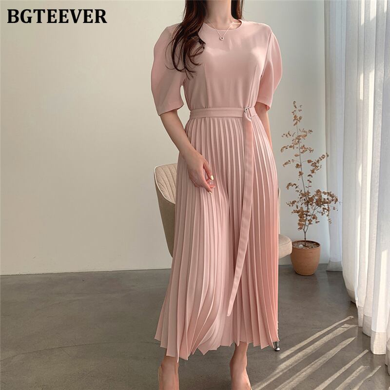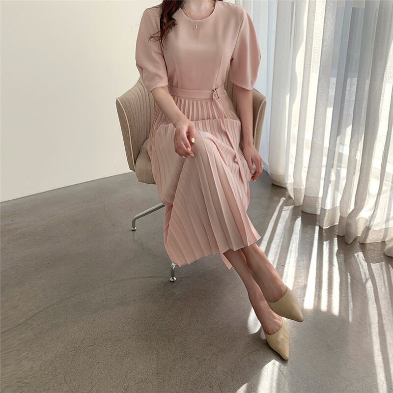 【新作】【送料無料】 BGTEEVEROネックサッシレディースドレスオフィスウェア半袖プリーツドレス2020夏ミディVestidosファム ショート ハーフスリーブ サマー 夏物 フェミニン 会社 学校 通勤や通学にも 12b164056269404