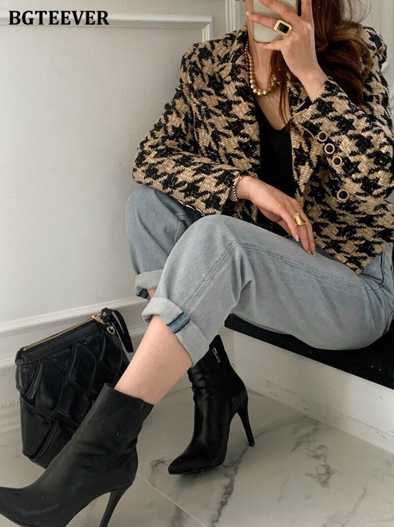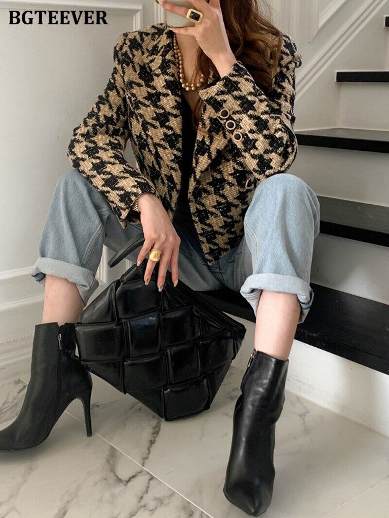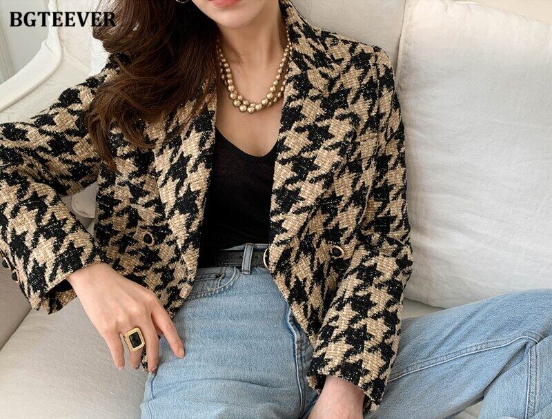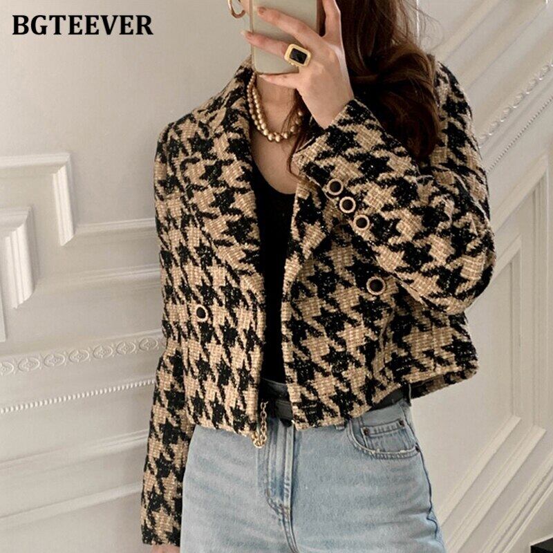 【新作】【送料無料】 BGTEEVER Winter Thicken Warm Women Houndstooth Woolen Blazer Chic Notched Collar Loose Double Breasted Short Blazers 2021 ショート ウィンター 冬物 12b138132610924