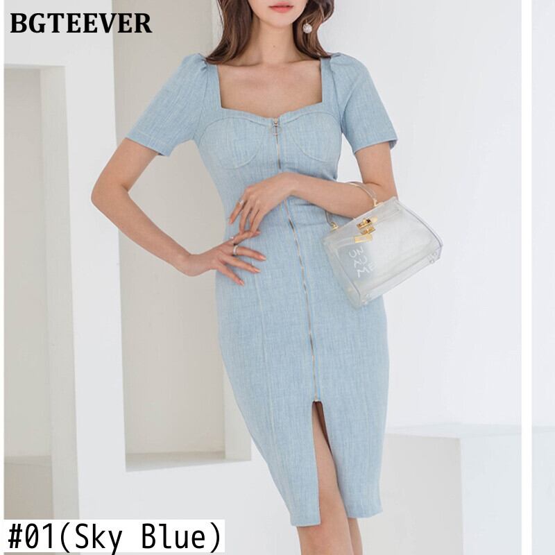 【新作】【送料無料】 BGTEEVERセクシースクエアカラーレディースドレスブルーデニムシースドレスOLBodyconVestidos半袖スプリットドレス2020 ショート ハーフスリーブ スクウェア 12b170994735366