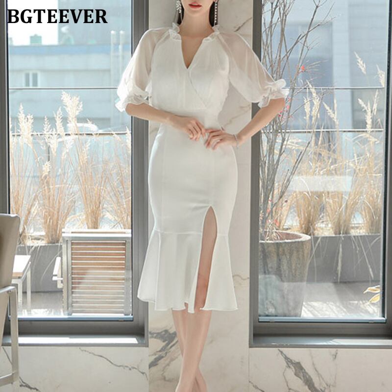 【新作】【送料無料】 BGTEEVERVネックホワイトシースレディースドレスハーフスリーブスリムウエストドレスオフィススプリットボディコンサマーベスティドス 半袖 夏物 会社 学校 通勤や通学にも 12b126384118649