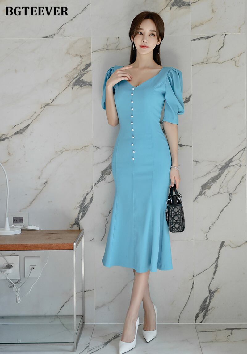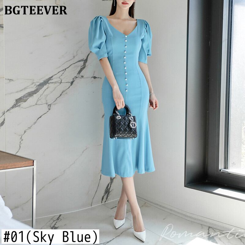 【新作】【送料無料】 BGTEEVEROLサマーVネックパフスリーブドレスシングルブレストボディコンドレススリムウエストVestidosレディースドレス2020 夏物 12b146861458074