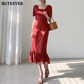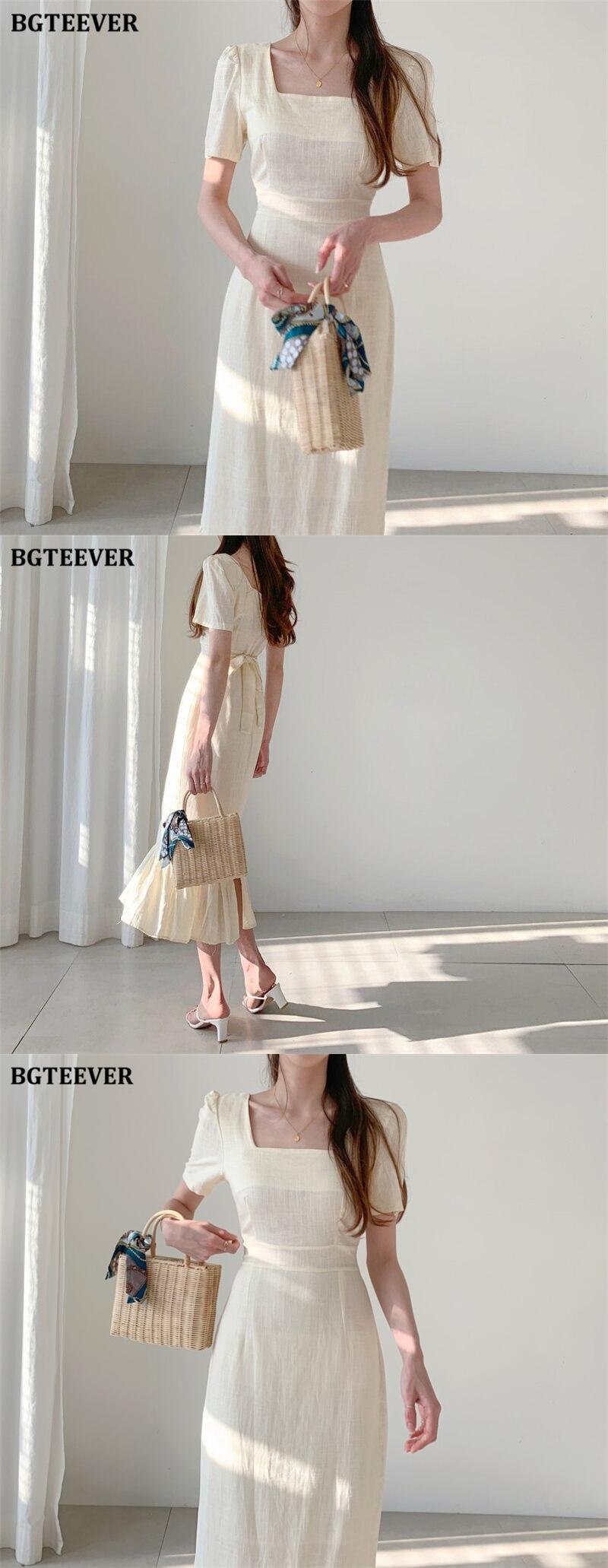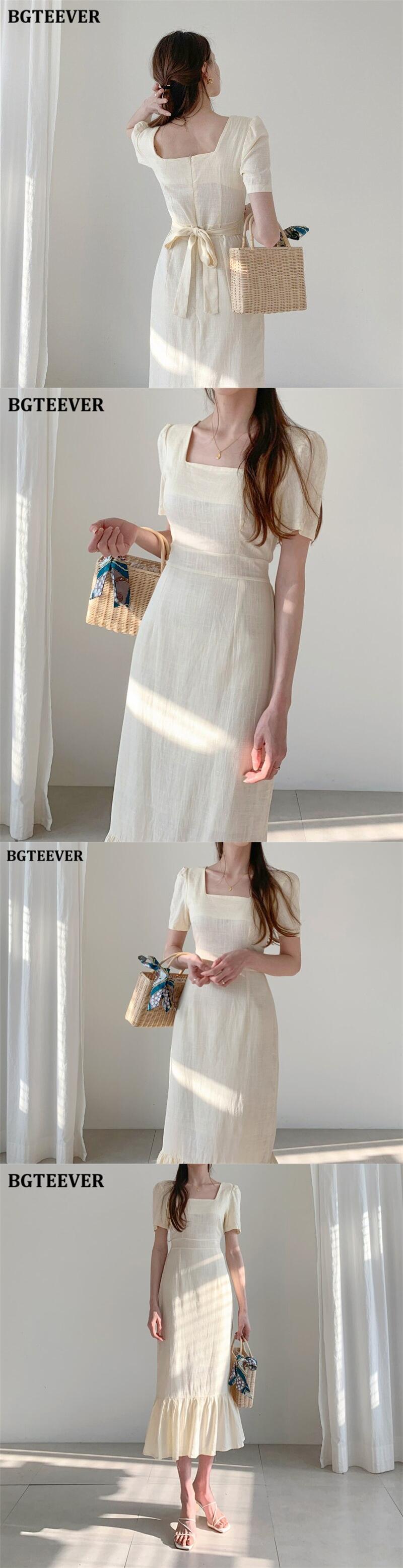 【新作】【送料無料】 BGTEEVERサマースクエアカラー半袖ドレスシックなスリムウエストスプリット女性マーメイドロングドレス ショート ハーフスリーブ 夏物 スクウェア 12b114027758002