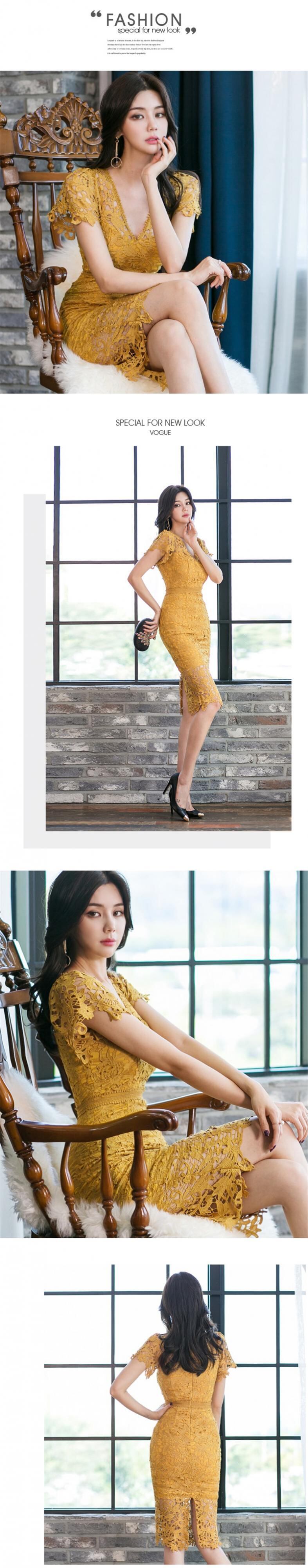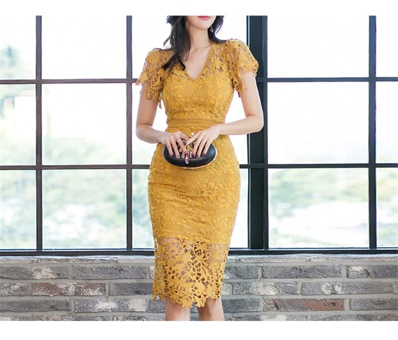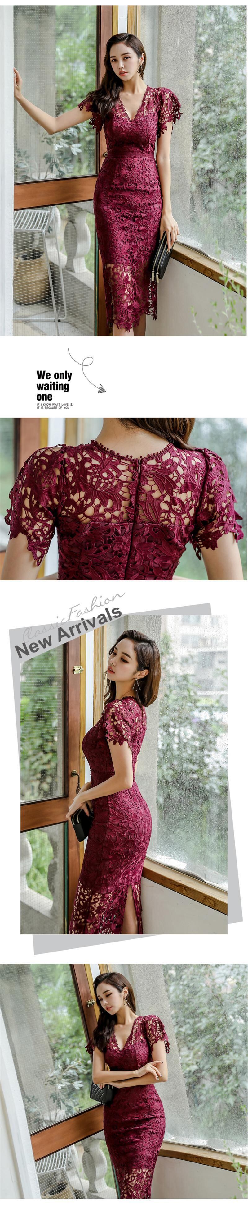 【新作】【送料無料】 BGTEEVERVネックレースドレス女性2020春夏半袖ペンシルドレス中空スプリットスリムウエストVestidos ショート ハーフスリーブ スプリング 春物 サマー 夏物 12b155489339098
