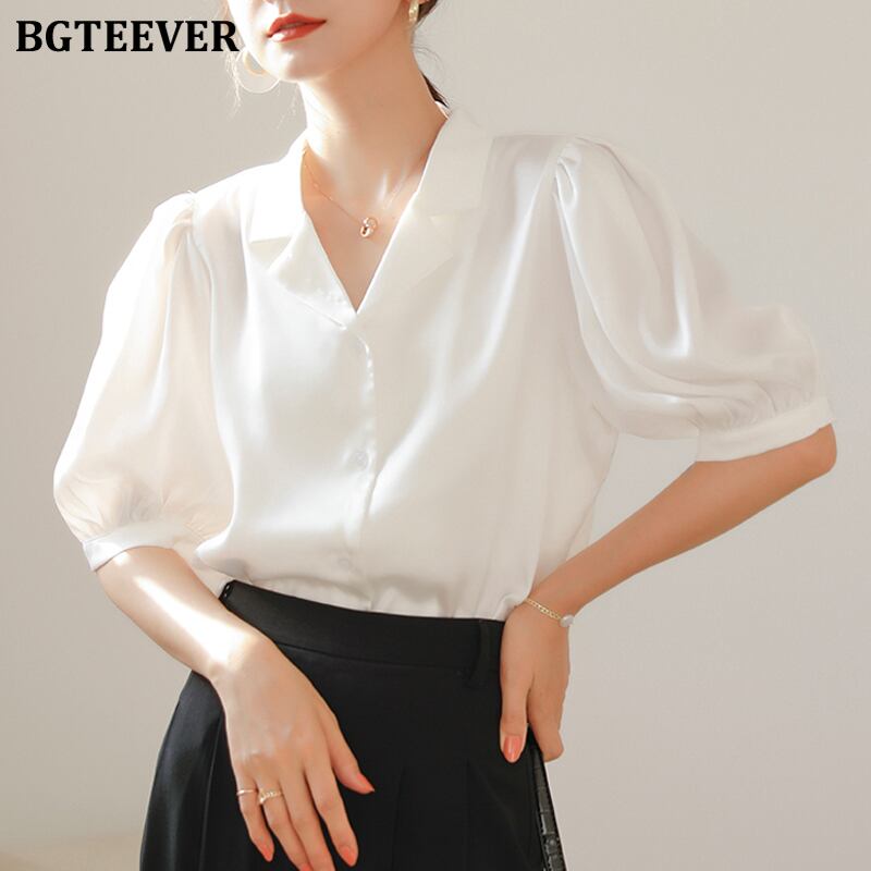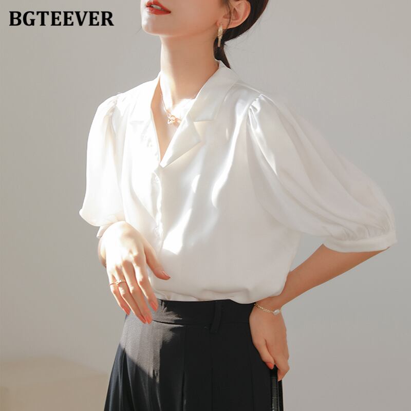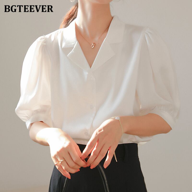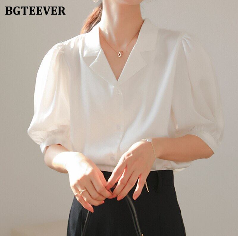【新作】【送料無料】 BGTEEVERヴィンテージパフスリーブシャツラペルシングルブレスト女性ホワイトブラウストップスサマールーズ2020 夏物 ビンテージ 12b110511990527