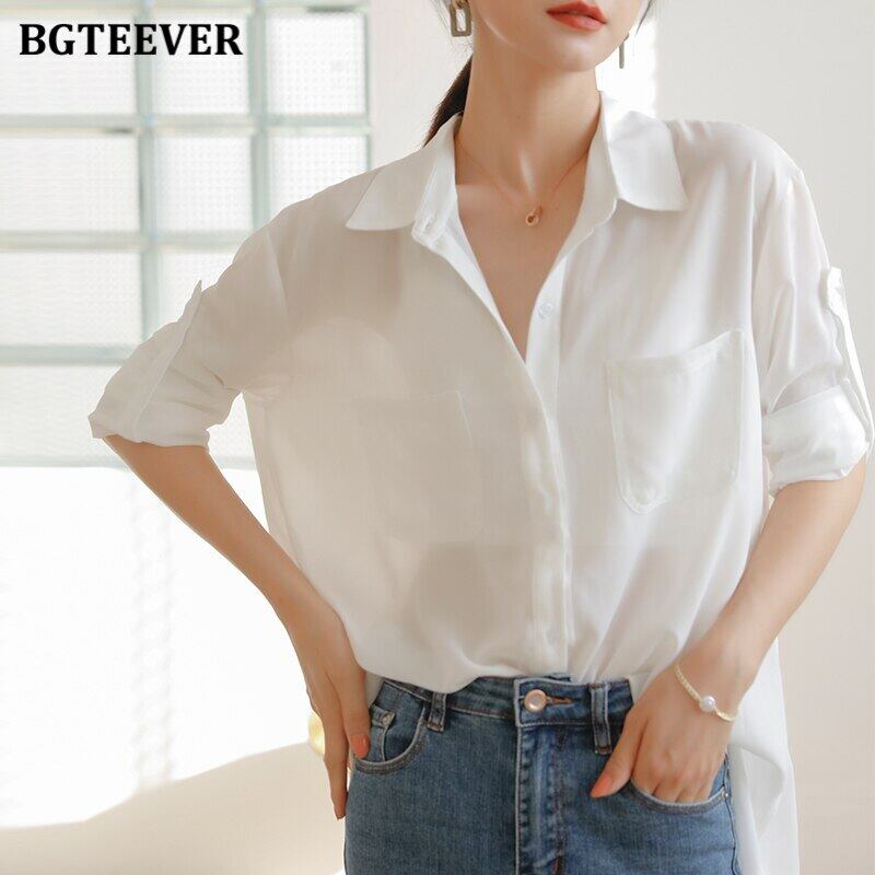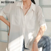 【新作】【送料無料】 BGTEEVERサマーウィメンズシフォンシャツシングルブレストルーズブラウストップスポケットホワイトシャツ2020 夏物 12b114579639887