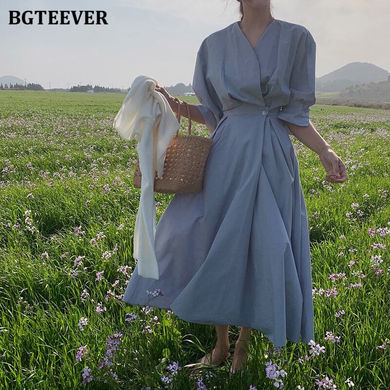 【新作】【送料無料】 BGTEEVERヴィンテージVネックAラインドレス伸縮性ボタンアップハーフスリーブミディドレス女性夏 半袖 エラスティック サマー 夏物 ビンテージ 12b161568234952