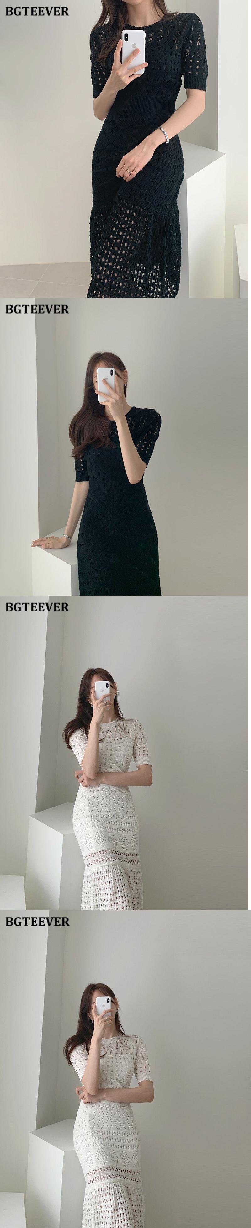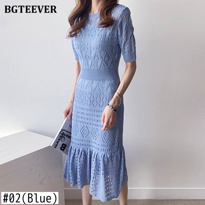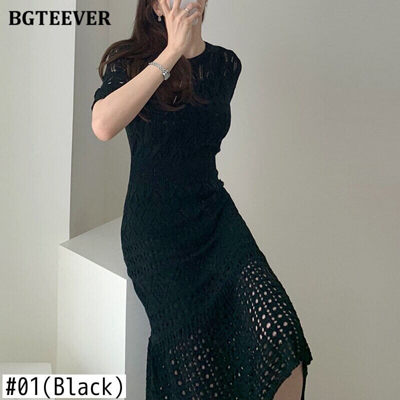 【新作】【送料無料】 BGTEEVEROネックシースドレスシックホローアウト半袖ミディドレスレディースサマーニット ショート ハーフスリーブ 夏物 12b114901250282