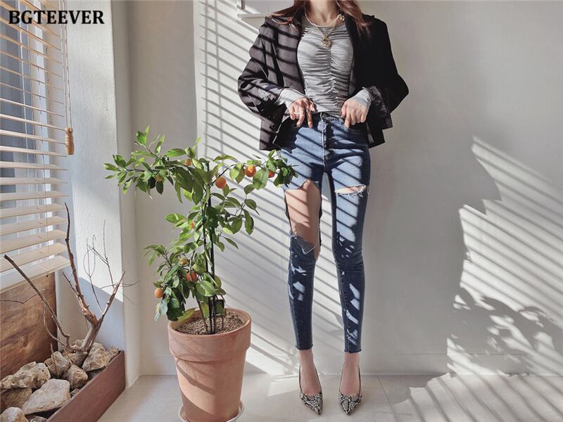 【新作】【送料無料】 BGTEEVERトレンディウエストデニムブルージーンズレディースストリートウェアリップドホールペンシルパンツ2020サマーストレッチジーンズ 夏物 12b144939926743