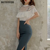 【新作】【送料無料】 BGTEEVER2ピースセットホローアウトフリルブラウス&ウエストサイドスプリットパッケージヒップ膝丈スカートレディースセット ラッフル 12b172831794407