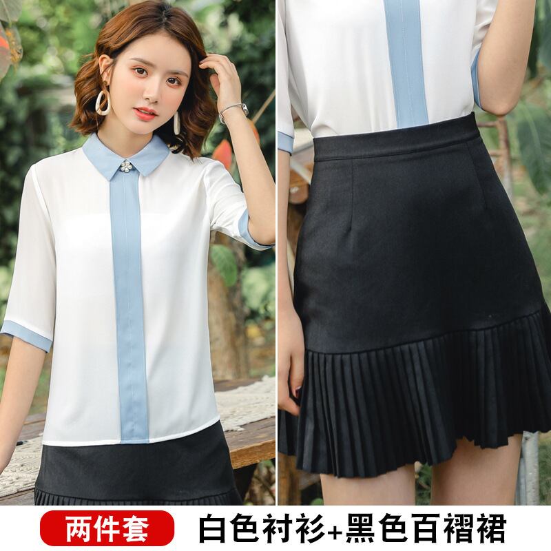 色:(ワンピース)白いシャツ,(ワンピース)ブルーシャツ,白いシャツ+黒いプリーツスカート,青いシャツ+黒いプリーツスカート