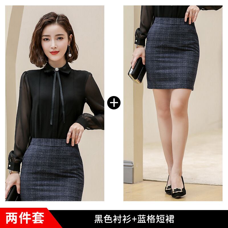 色:ワンピースホワイトシャツ,シングルブラックシャツ,ワンピースライトグレーシャツ,ライトグレーのシャツ+黒のスカート,黒のシャツ+青のグリッドスカート,白シャツ+黒パンツ