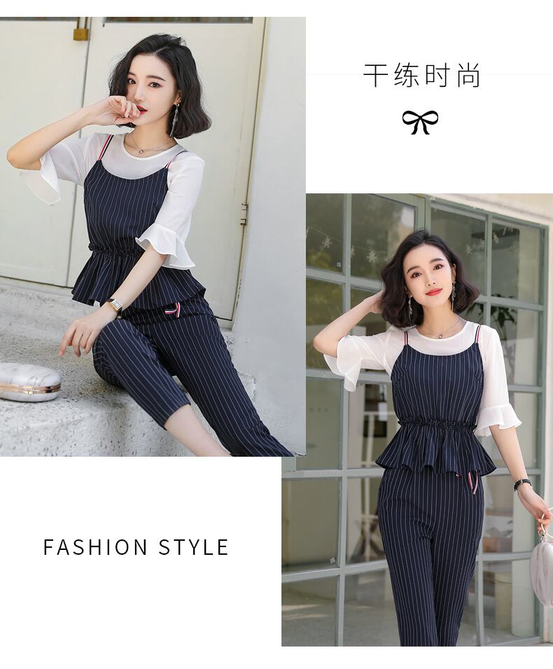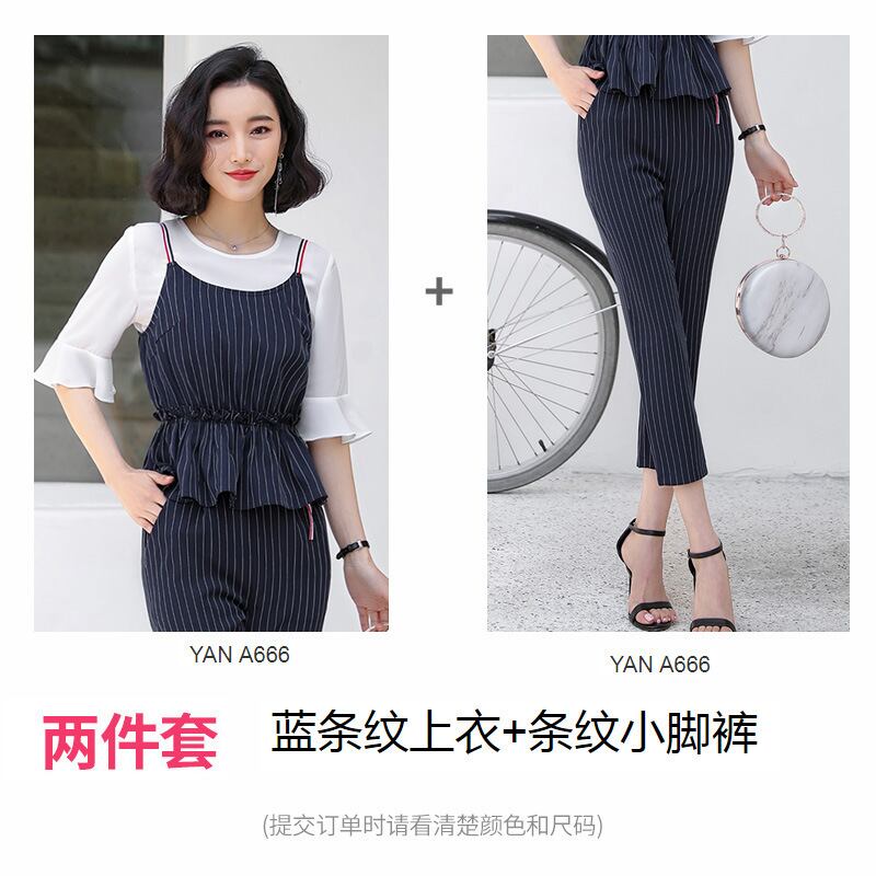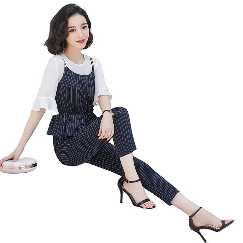 【新作】【送料無料】 スモールスリングスリーピーススーツ2020夏の新しいファッションスーツ女性ウエスタンスタイルストライプウエストフリルプロパンツ-アリババ サマー 夏物 12b38126964295
