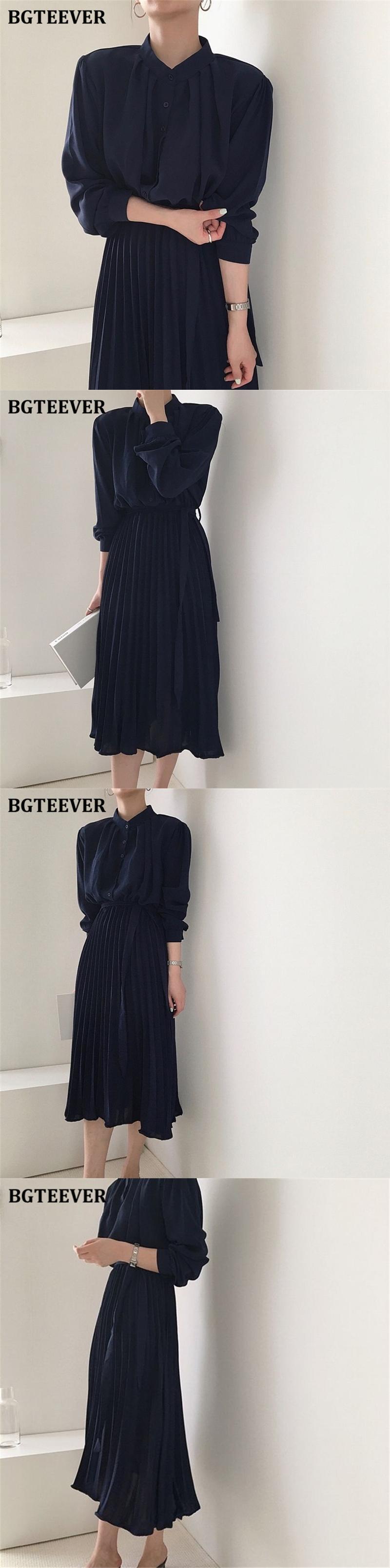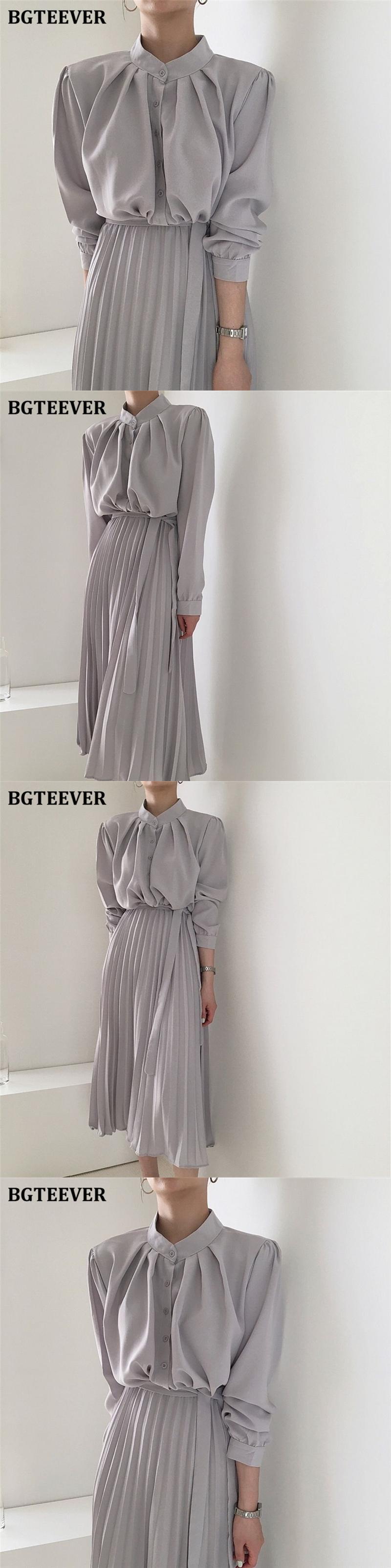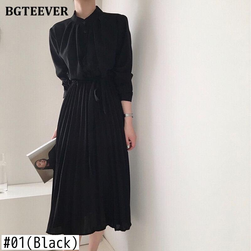 【新作】【送料無料】 BGTEEVERスタンドカラーシングルブレストレディースドレスオフィスウェアプリーツレースアップミディドレス2020秋のVestidos オータム 秋物 会社 学校 通勤や通学にも 12b178224101158