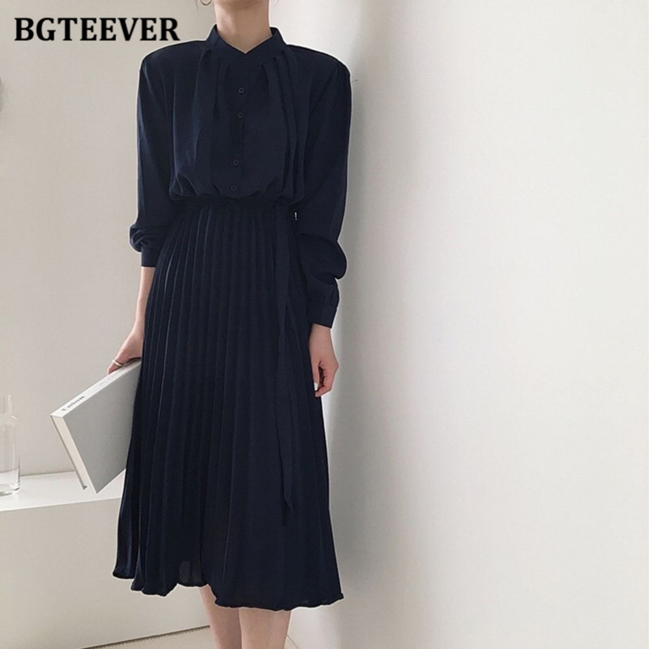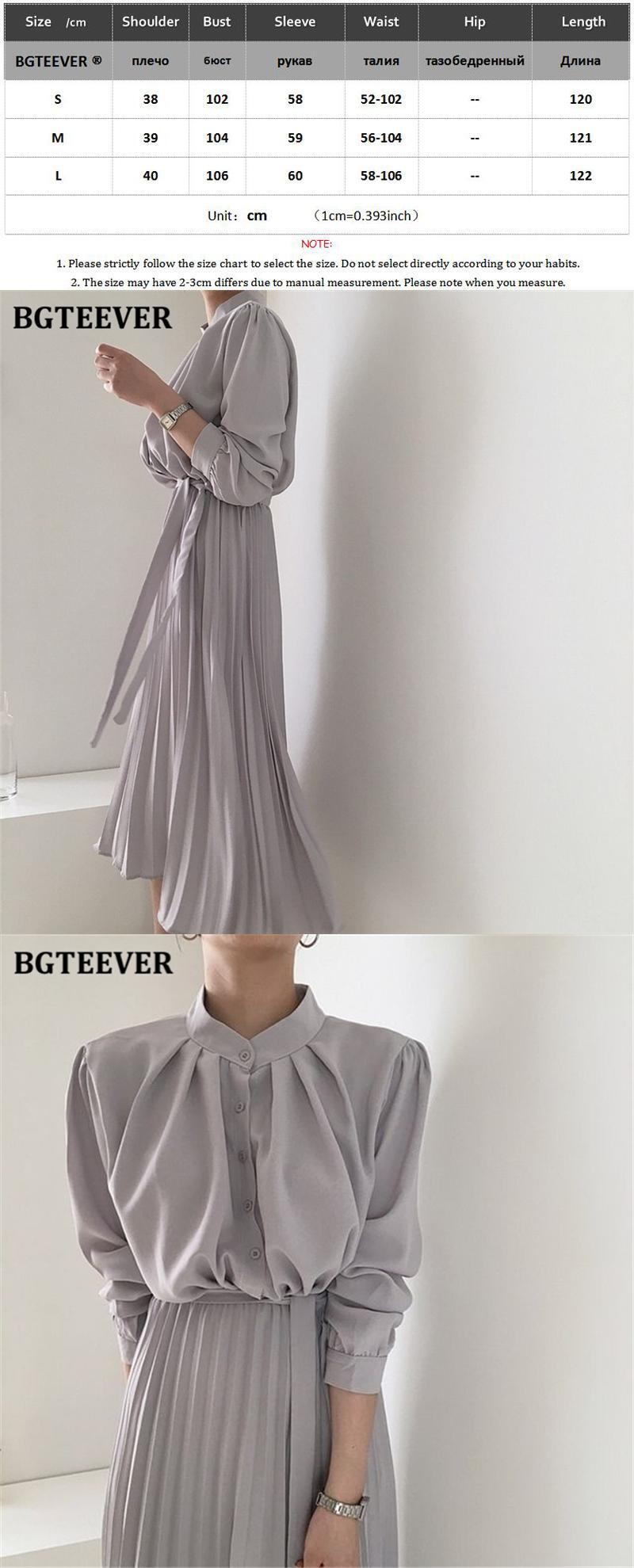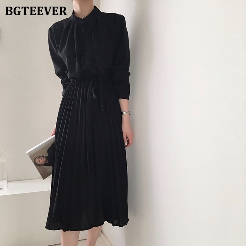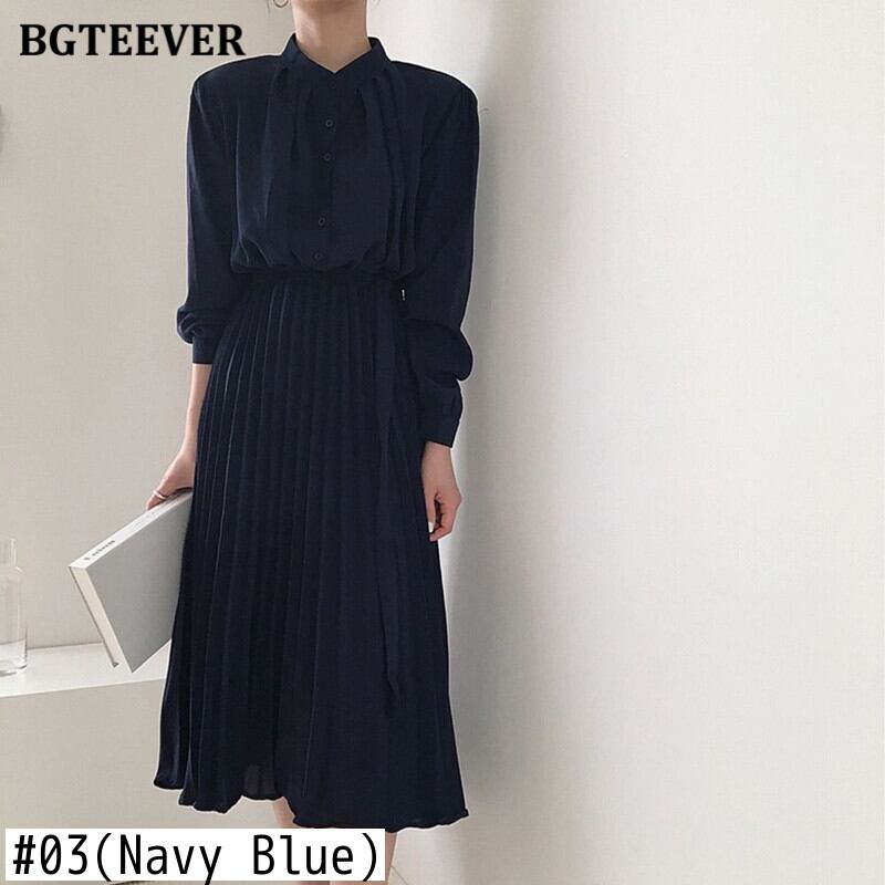【新作】【送料無料】 BGTEEVERスタンドカラーシングルブレストレディースドレスオフィスウェアプリーツレースアップミディドレス2020秋のVestidos オータム 秋物 会社 学校 通勤や通学にも 12b178224101158
