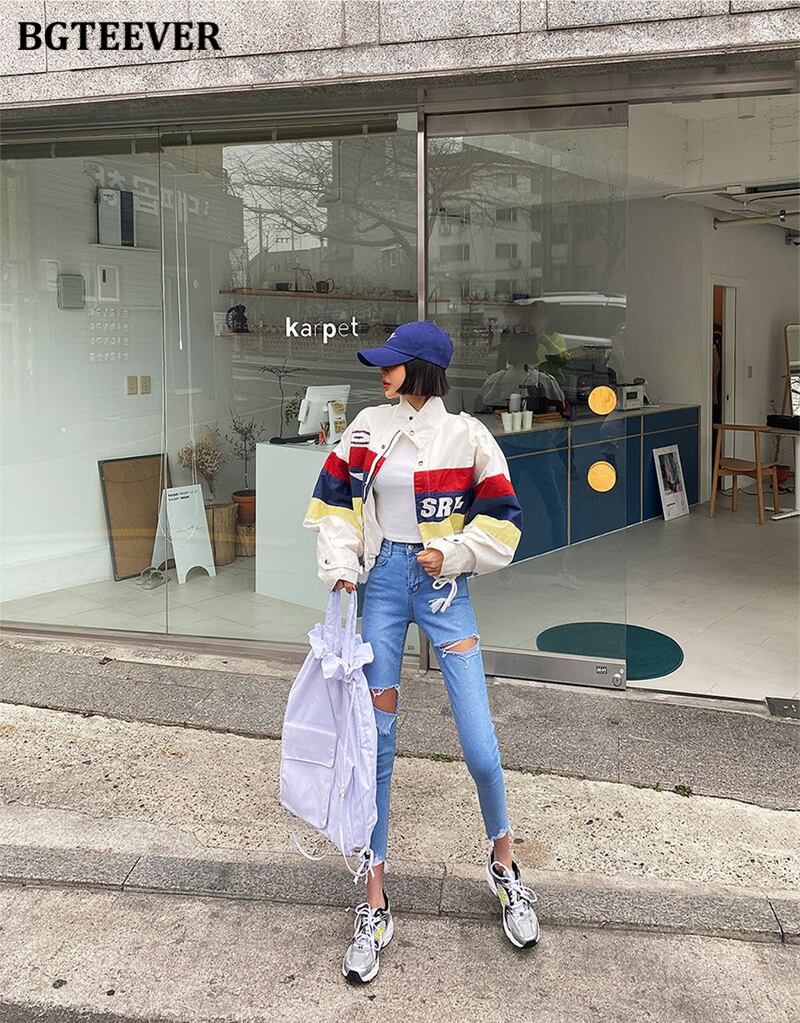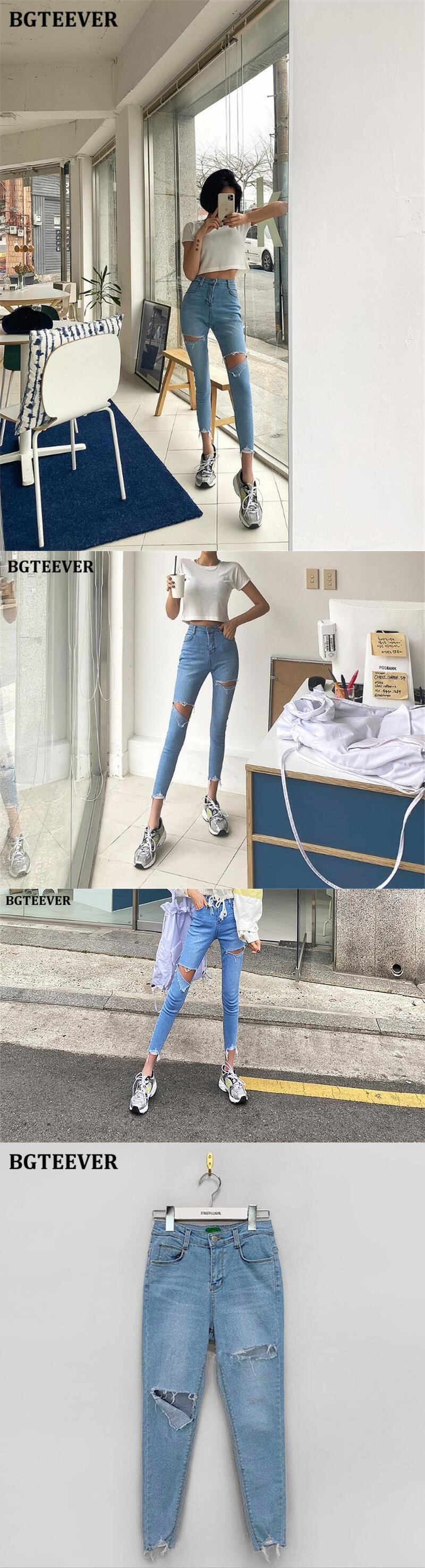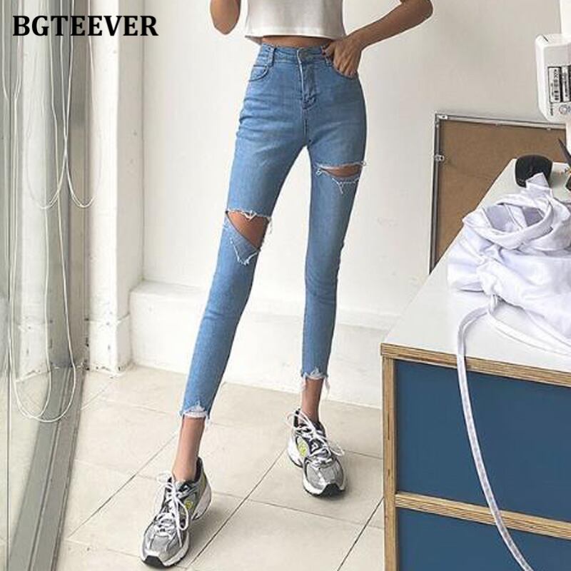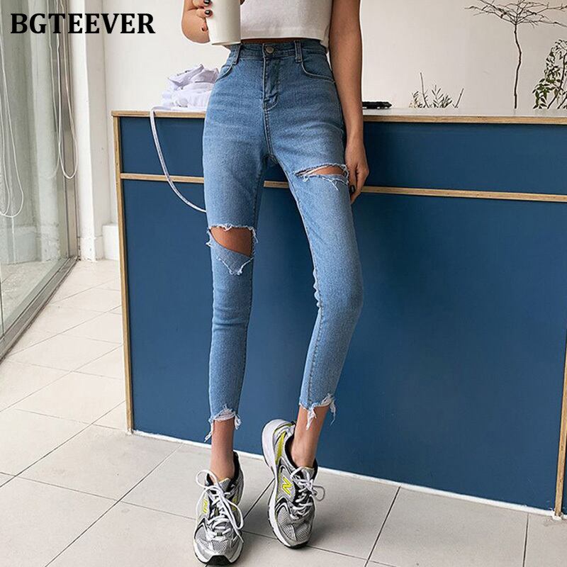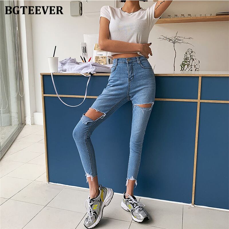 【新作】【送料無料】 BGTEEVERオータムスキニーリップドホールレディースデニムジーンズテルウエストストレッチイレギュラージーンズ2020シックボトムス 秋物 12b114165758588